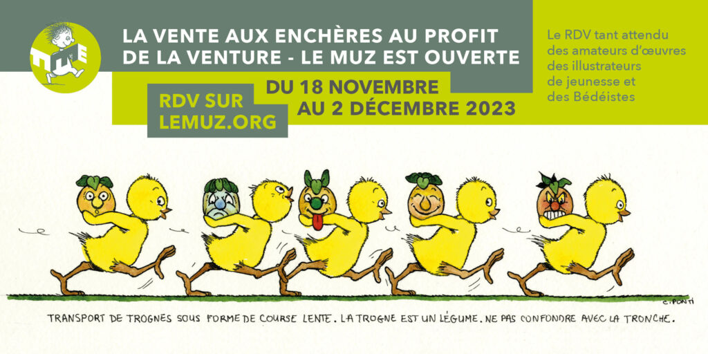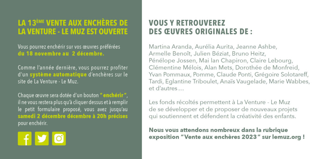 Du 18 novembre au 2 décembre sur le site de La Venture – Le Muz, la vente aux enchères peut avoir lieu grâce à la générosité des artistes qui soutiennent l’association et nous les en remercions chaleureusement !