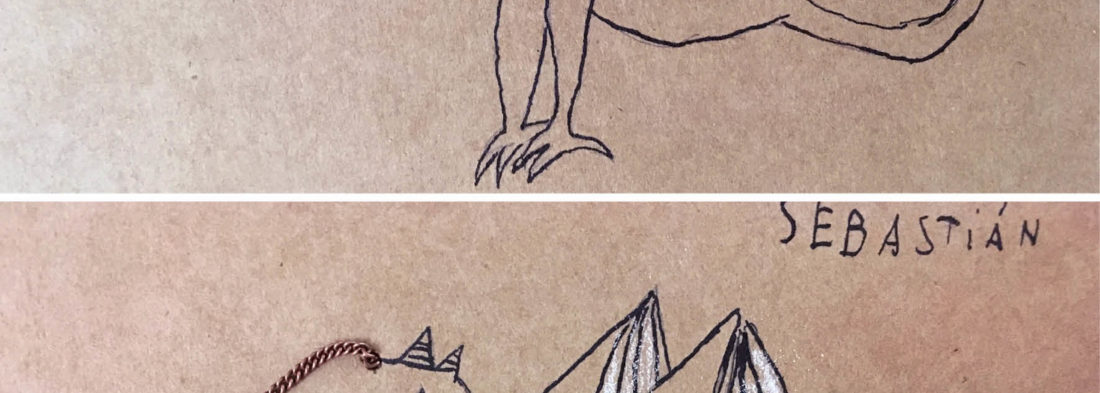 Les enfants devaient créer une petite carte animée dans l’esprit des cartes anciennes avec une chaînette. Plumes et encre de Chine étaient à disposition. Un premier temps était réservé à la découverte du travail à la plume avec des dessins libres sur du papier brouillon. Expérience minutieuse ou les gestes sont mesurés, la position de la main et de la plume étant primordiale à la réussite du tracé. Enfin, chaque enfant réfléchissait à son dessin en intégrant dans sa réflexion la place occupée par la chaînette après le dessin définitif à la plume réalisé. Le dessin achevé et la chaînette fixée sur la carte, les enfants pouvaient rehausser leurs créations avec un crayon blanc ou quelques éléments découpés dans du papier coloré.