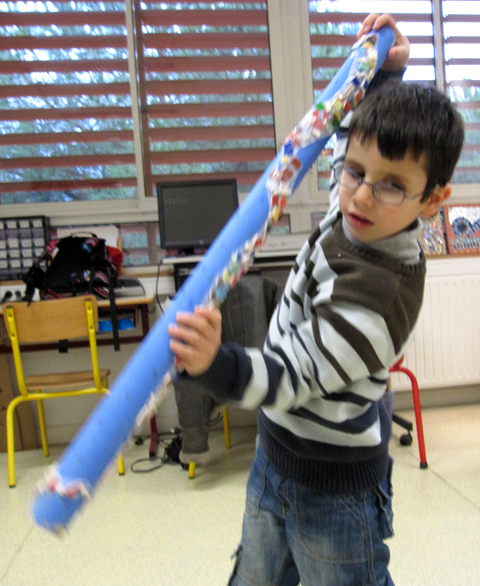 Jeudi 14 avril: L’école du Val de Tignet avec ces 27 élèves pousse tables et chaises pour travailler en groupe autour des pots de colle teintée en bleu. Le papier de soie vient des boîtes à chaussure et prend bientôt de belles couleurs autour du bâton de chaque enfant. Quelques chemises tâchées sècheront jusqu’à ce soir pour éviter la colère des mamans. C’est bien agréable d’avoir un instrument personnalisé.
