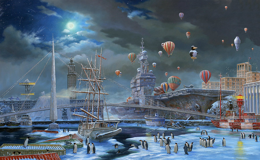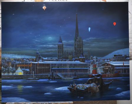 J’ai déplacé les docks devant la cathédrale et représenté des choses actuelles H2O – qui n’était encore qu’à l’état de projet- est posé sur un bateau. Le « marégraphe club » pourrait exister… Je peins toujours mes tableaux en nocturne.