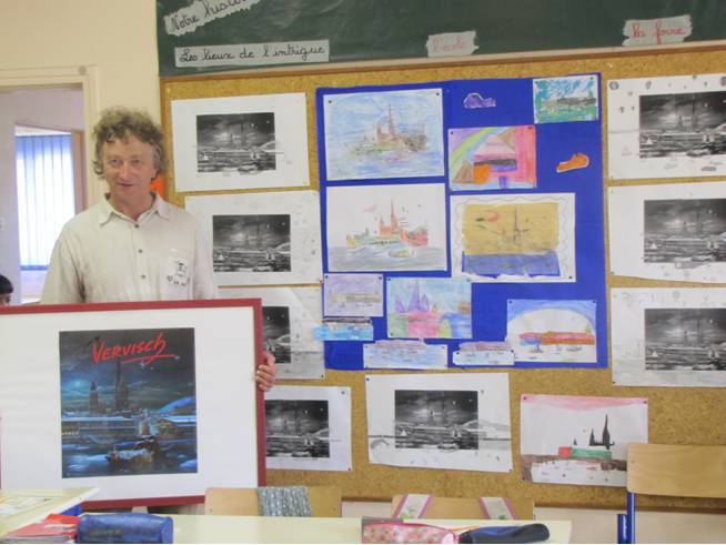 J’ai présenté aux enfants une reproduction du tableau « les énervés de Rouen » de Dominique Vervisch, peintre Rouennais, qui rend à sa manière hommage au célèbre tableau (qui fascinait Dali) qui trône au musée de Rouen « Les énervés de Julièges ». Les enfants l’ont pris en compte dans leur histoire. avant de la publier, j’en ai informé le peintre… qui a proposé de nous rencontrer !