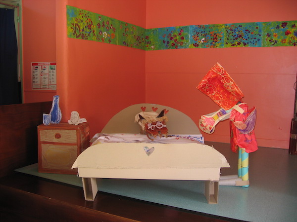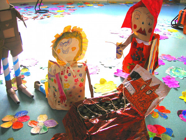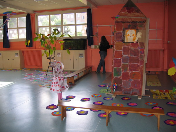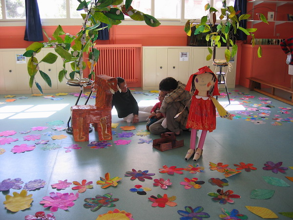 Il était une fois dans la ville du Pré Saint-Gervais, une école maternelle qui désirait travailler toute l’année sur le conte du Petit chaperon rouge. Comment faire ? Les enseignants et les enfants ont appelé très fort: Gloria !!!! et la sorcière est arrivée avec son balai , ses papiers et ses couleurs pour recréer la belle histoire. Petits et grands ont dessiné , modelé, colorié à l’encre, aux feutres… et en quelques mois le conte a surgi de sous terre. Dans la plus grande salle de l’école , parents, grands – parents , et amis sont venus voir le petit chaperon rouge, la grand-mère dans son lit, le chasseur… et ils ne se sont pas fait manger par le loup.
