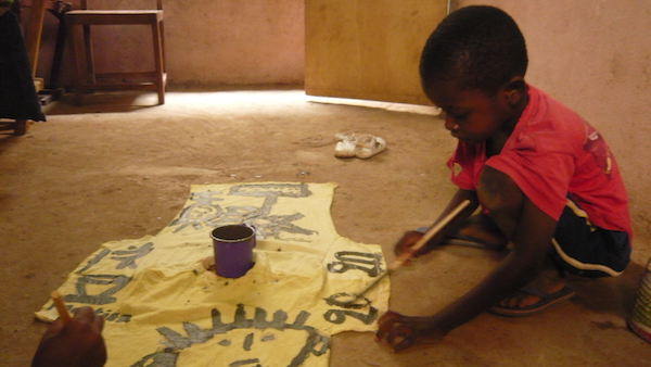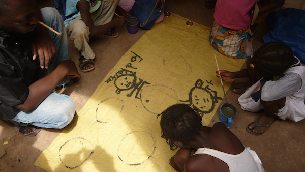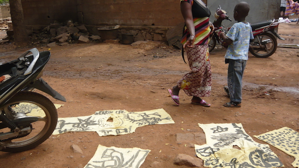 Les premières minutes, les enfants ne savent pas trop sur quel pied danser. Et puis, c’est parti. On étale les tissus au sol. On partage la terre, on distribue les pinceaux. Nous travaillons partout, dans la classe, dans la cour d’entrée, dans la rue. Près de nous, les femmes cuisinent, des artisans nous montrent comment nouer les coiffes pour les mariages. Les toiles des enfants sèchent au soleil sur la route.