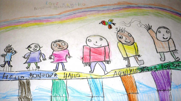 Les enfants de Berlin ont souvent été surpris par les retours de ce projet. Un exemple : avant mon départ pour Bamako, la directrice de l’école de Berlin m’avait donné pour les élèves bamakois, des tee-shirts blancs avec le sigle de son école. Je suis revenue de Bamako avec ces mêmes tee-shirts… mais ils avaient été teints et décorés par les enfants de Bamako pour les Berlinois, c’était un cadeau très concret et pour le moins surprenant : les tee-shirts étaient jaunes, couverts de visages, d’animaux et de prénoms!