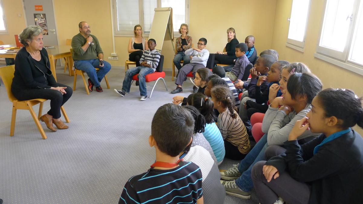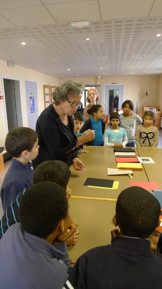 L’atelier s’est ouvert par un échange entre les enfants et l’illustratrice qui leur a révélé pourquoi elle s’était mise à la création d’albums. « J’ai commencé à faire des albums pour moi, pour me prouver que l’image suffisait, « Les images, ça raconte ». L’image parle à nos sentiments, nos sensations. Il n’y a plus une voix pour nous dire ce qu’il faut en penser, les sentiments deviennent paroles qui expriment des sentiments. »