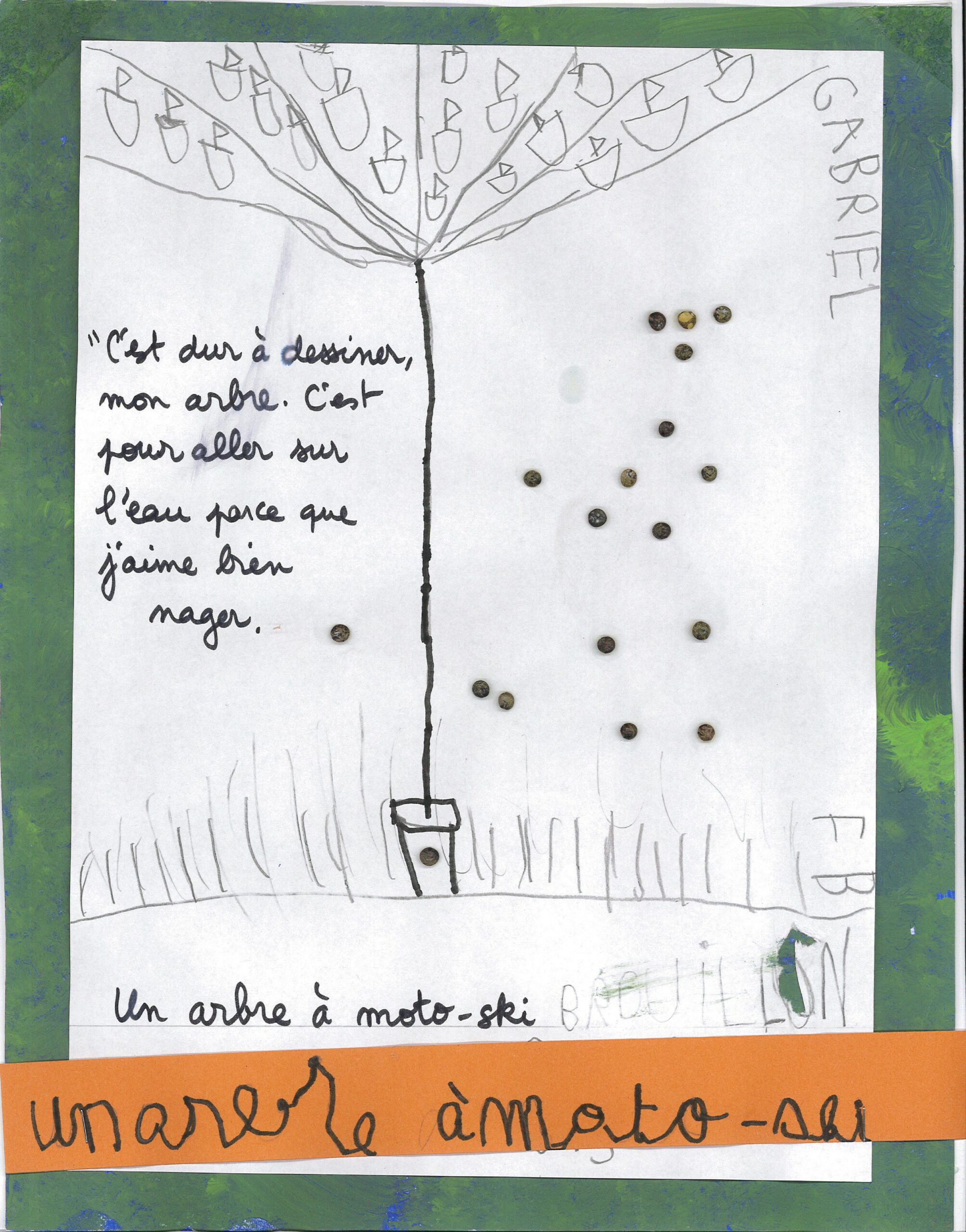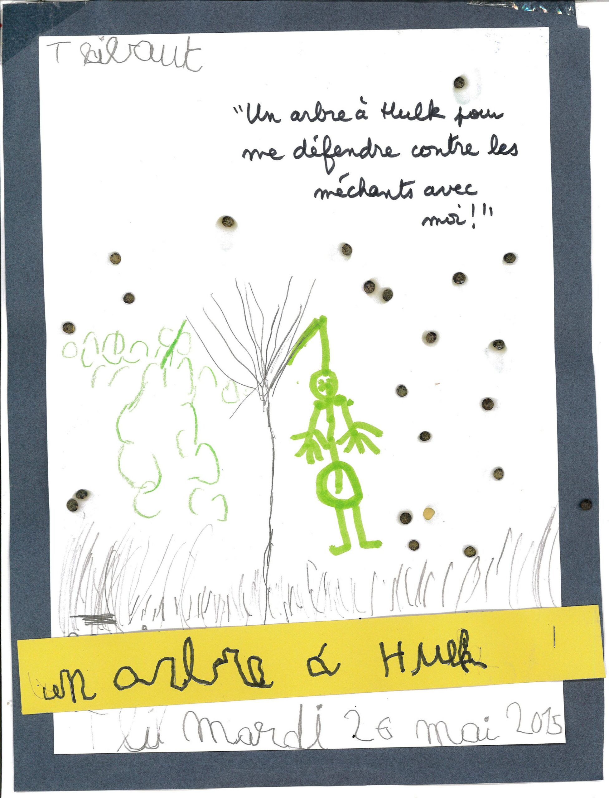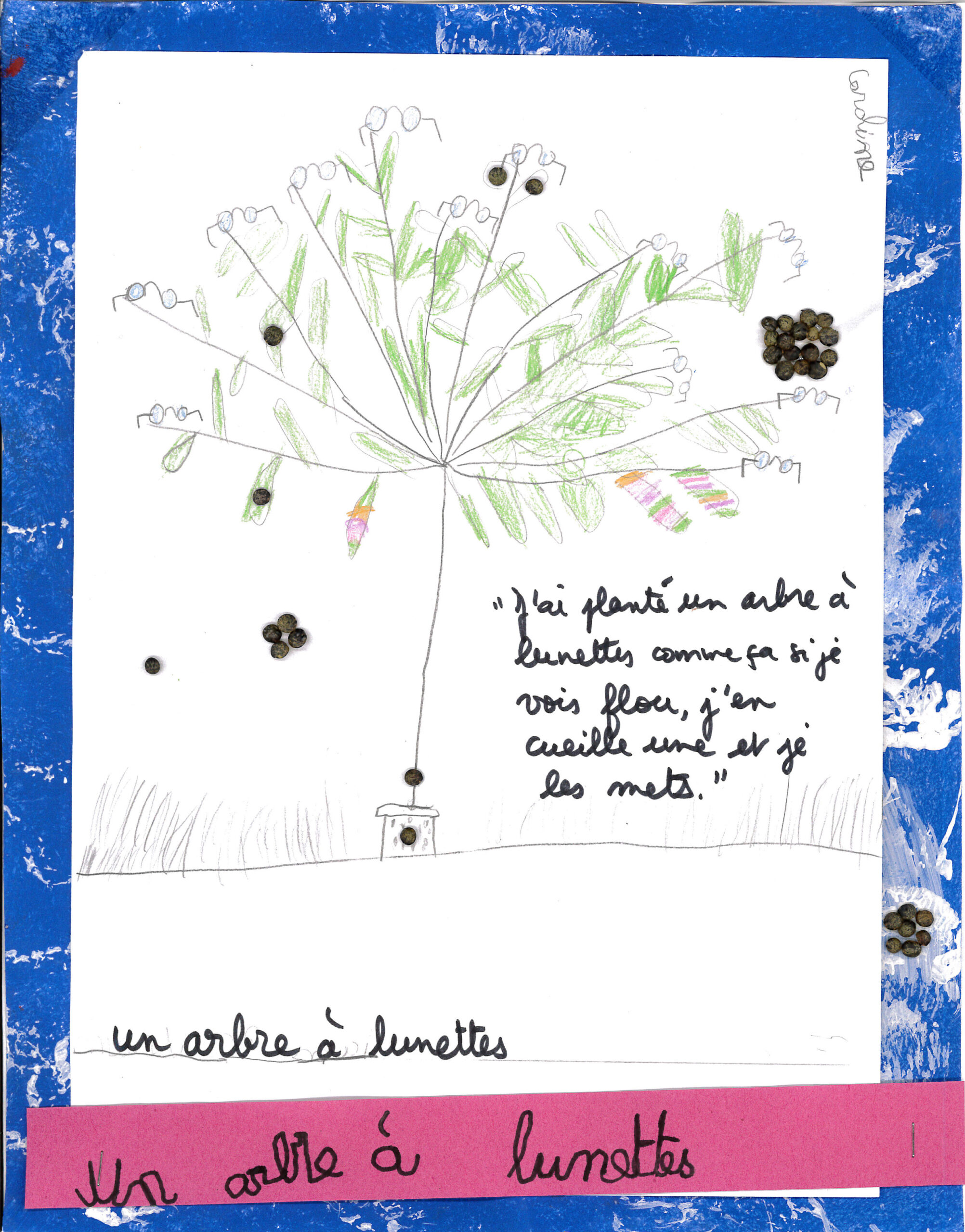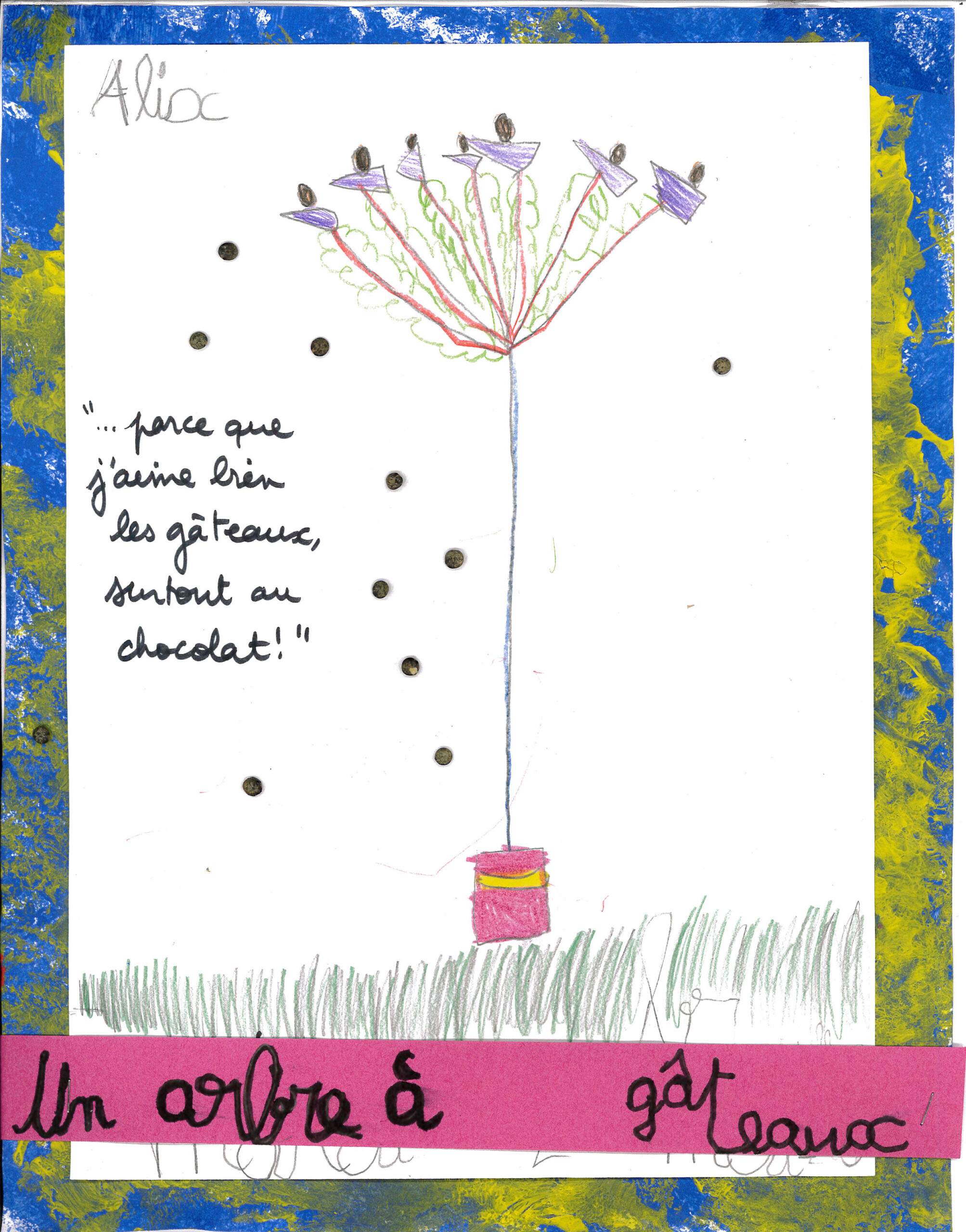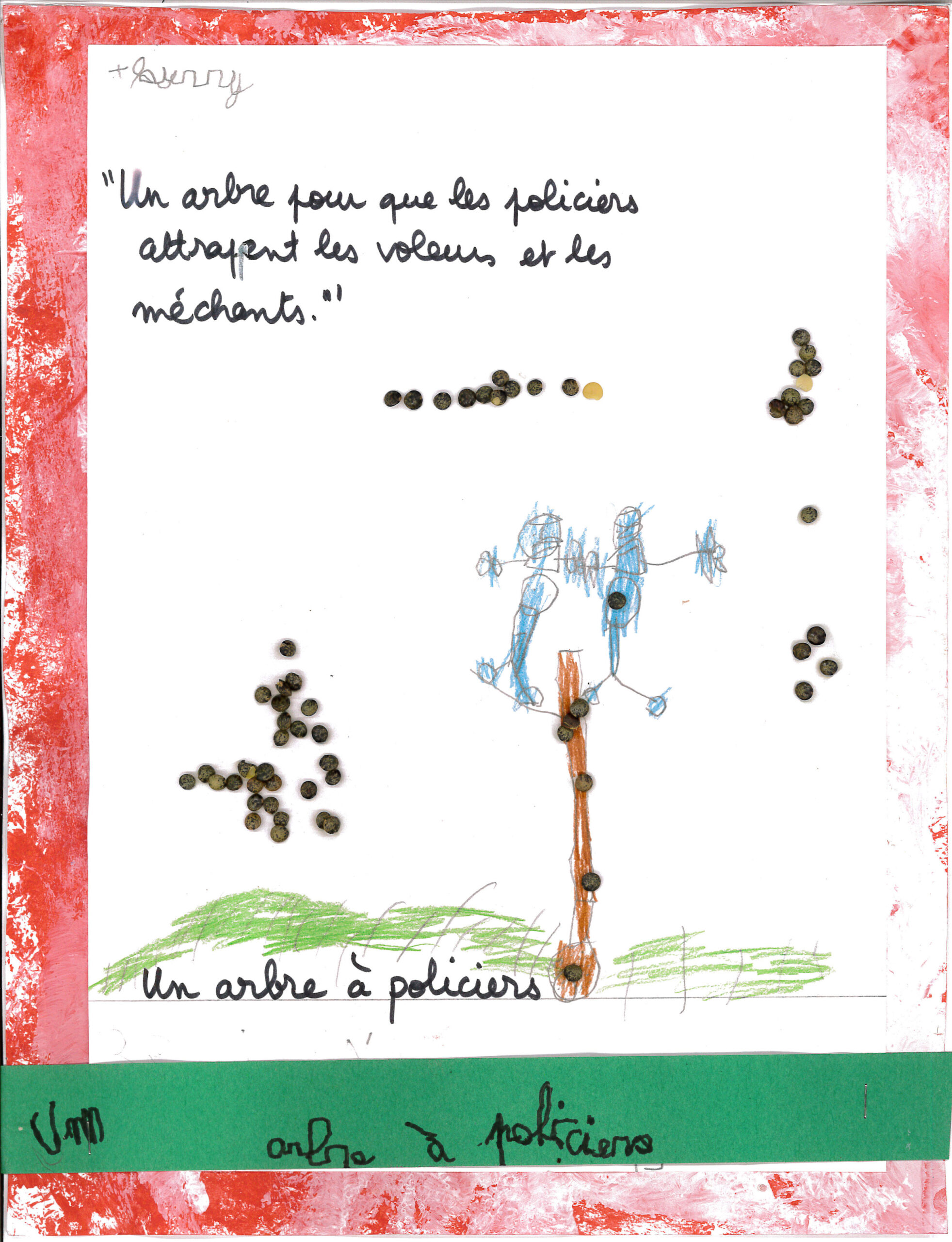 Monsieur découverts dans l’histoire du Chapeau à secrets, les enfants, accompagnés par Vanessa, ont tous inventé leur arbre à graines magiques. Au départ, ils ont eu du mal à sortir des sentiers battus par l’album et à s’autoriser l’invention de graines de leur choix. Mais après leur avoir glissé quelques idées, certains ont eu du mal à arrêter d’en planter ! Vanessa leur a fait dessiner leur idée, puis leur a demandé à chacun de donner un nom à leur création et d’expliquer leur arbre : informations qu’elle a soigneusement notées. Chaque enfant a pu recopier le nom de son arbre sur sa feuille et Vanessa y a retranscrit fidèlement leurs propos.