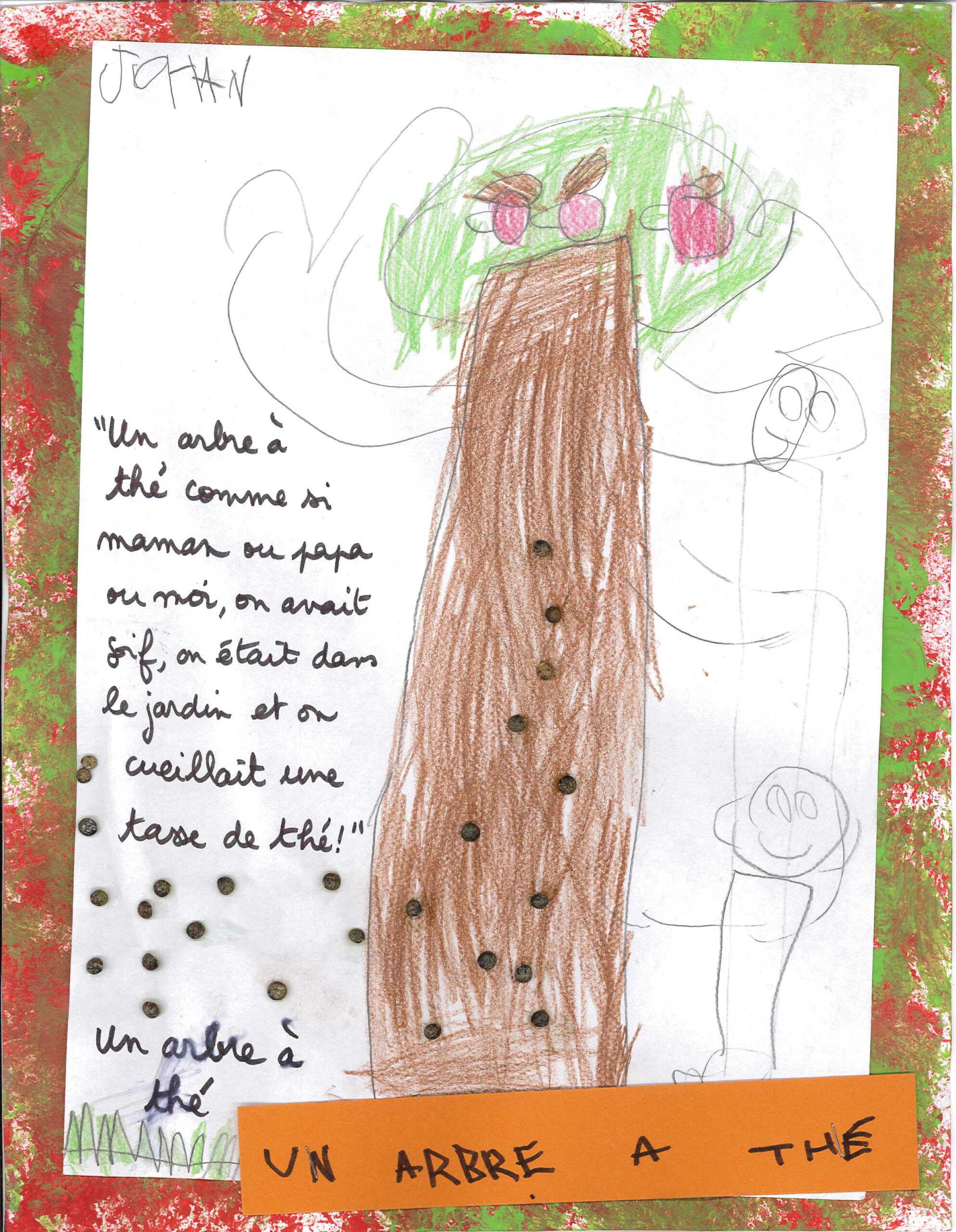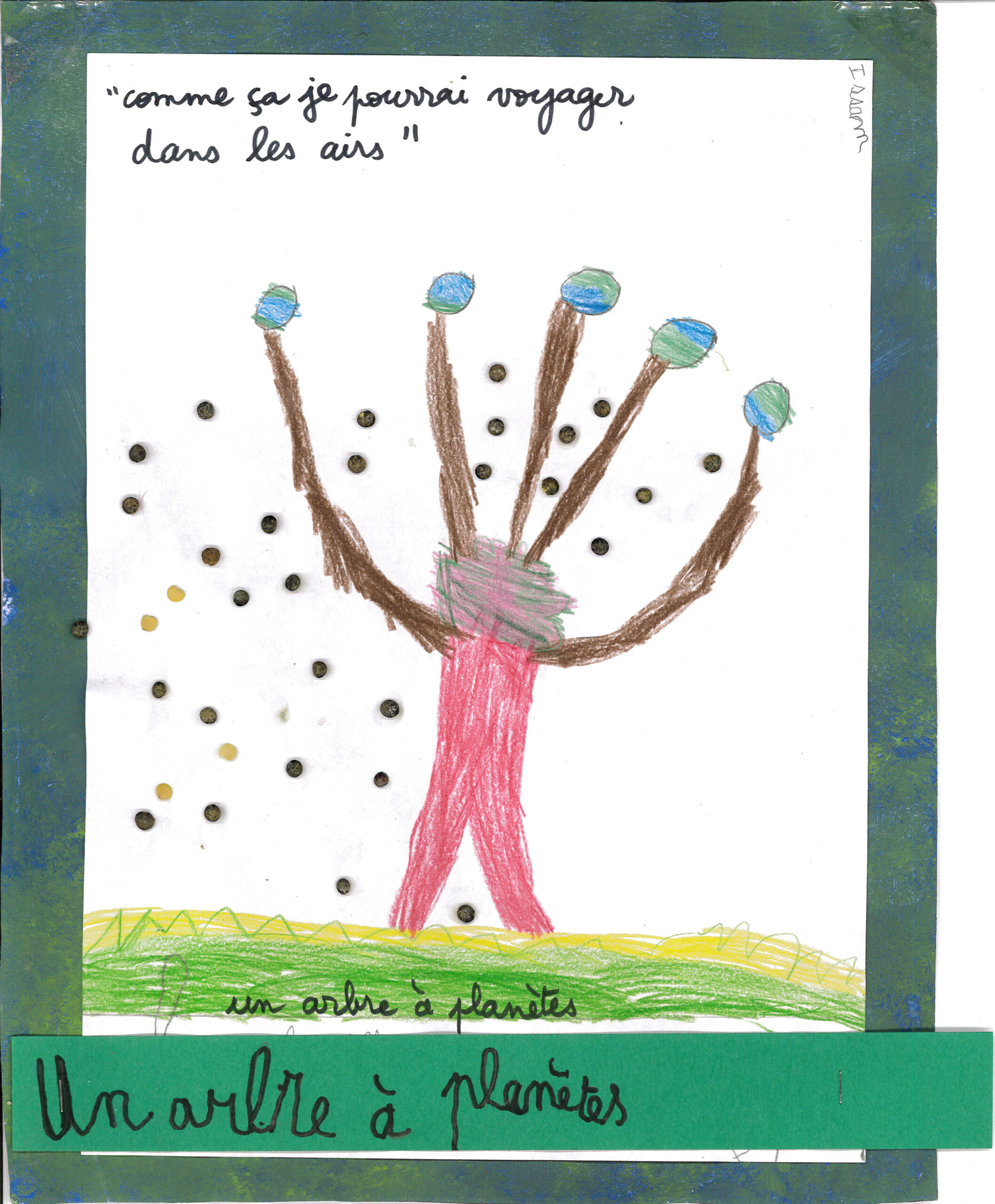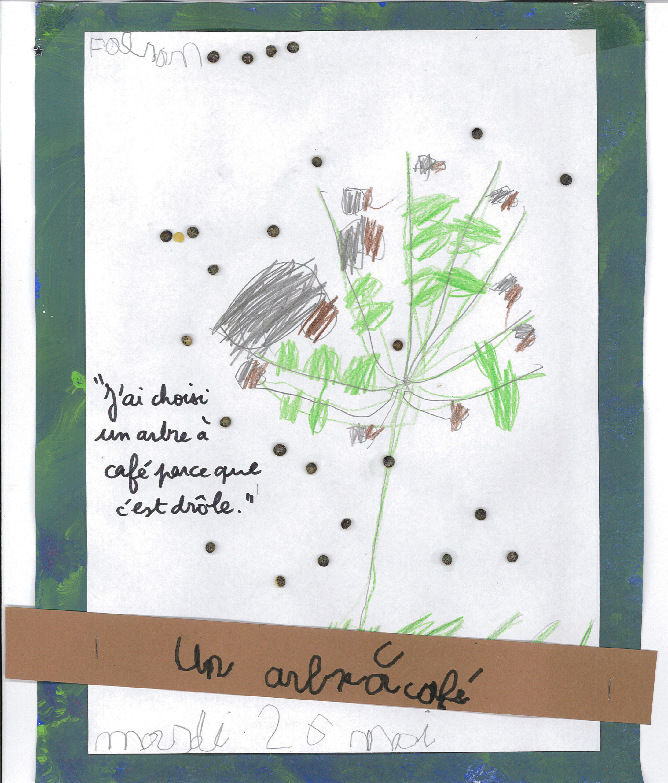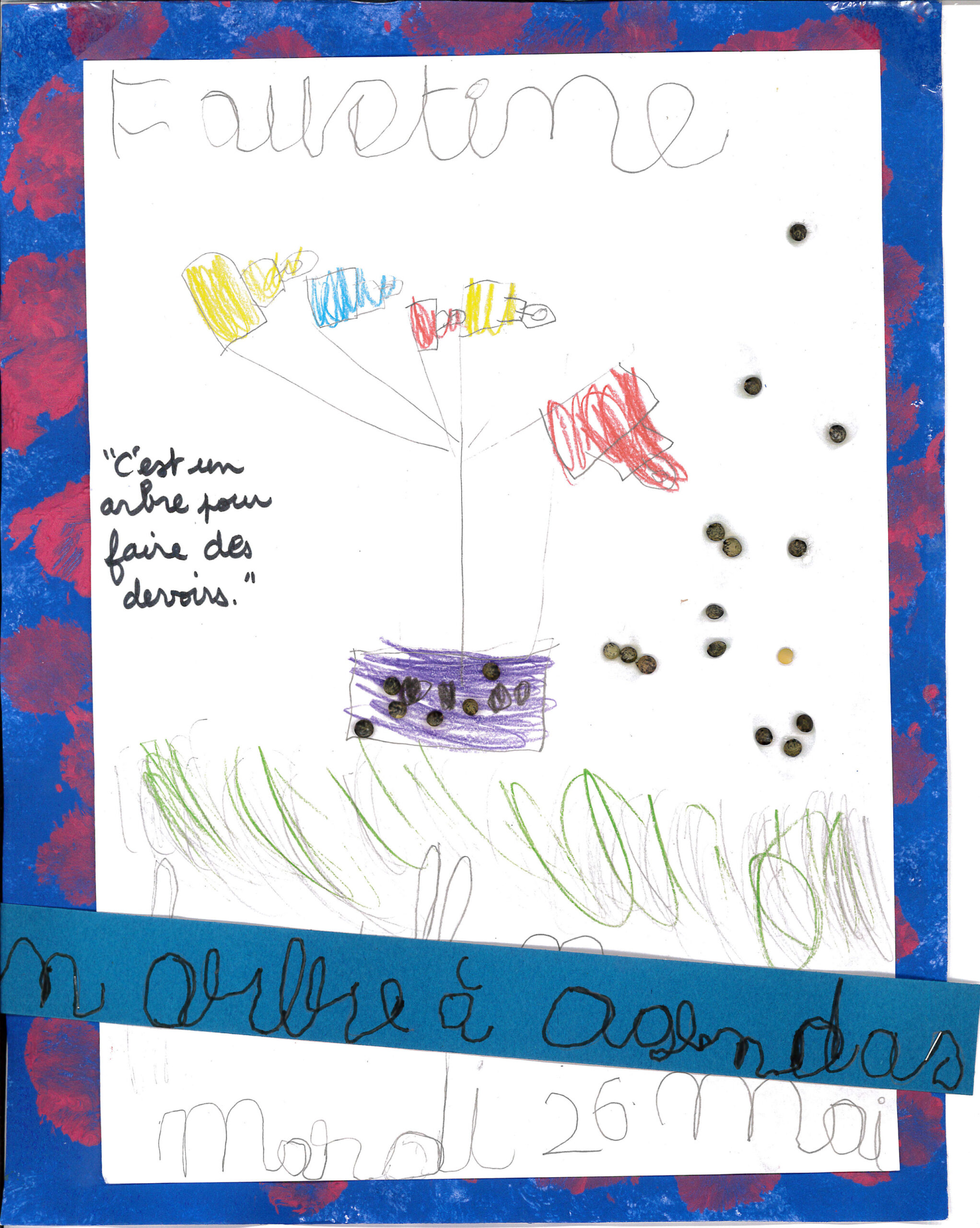 Monsieur découverts dans l’histoire du Chapeau à secrets, les enfants, accompagnés par Vanessa, ont tous inventé leur arbre à graines magiques. Au départ, ils ont eu du mal à sortir des sentiers battus par l’album et à s’autoriser l’invention de graines de leur choix. Mais après leur avoir glissé quelques idées, certains ont eu du mal à arrêter d’en planter ! Vanessa leur a fait dessiner leur idée, puis leur a demandé à chacun de donner un nom à leur création et d’expliquer leur arbre : informations qu’elle a soigneusement notées. Chaque enfant a pu recopier le nom de son arbre sur sa feuille et Vanessa y a retranscrit fidèlement leurs propos.