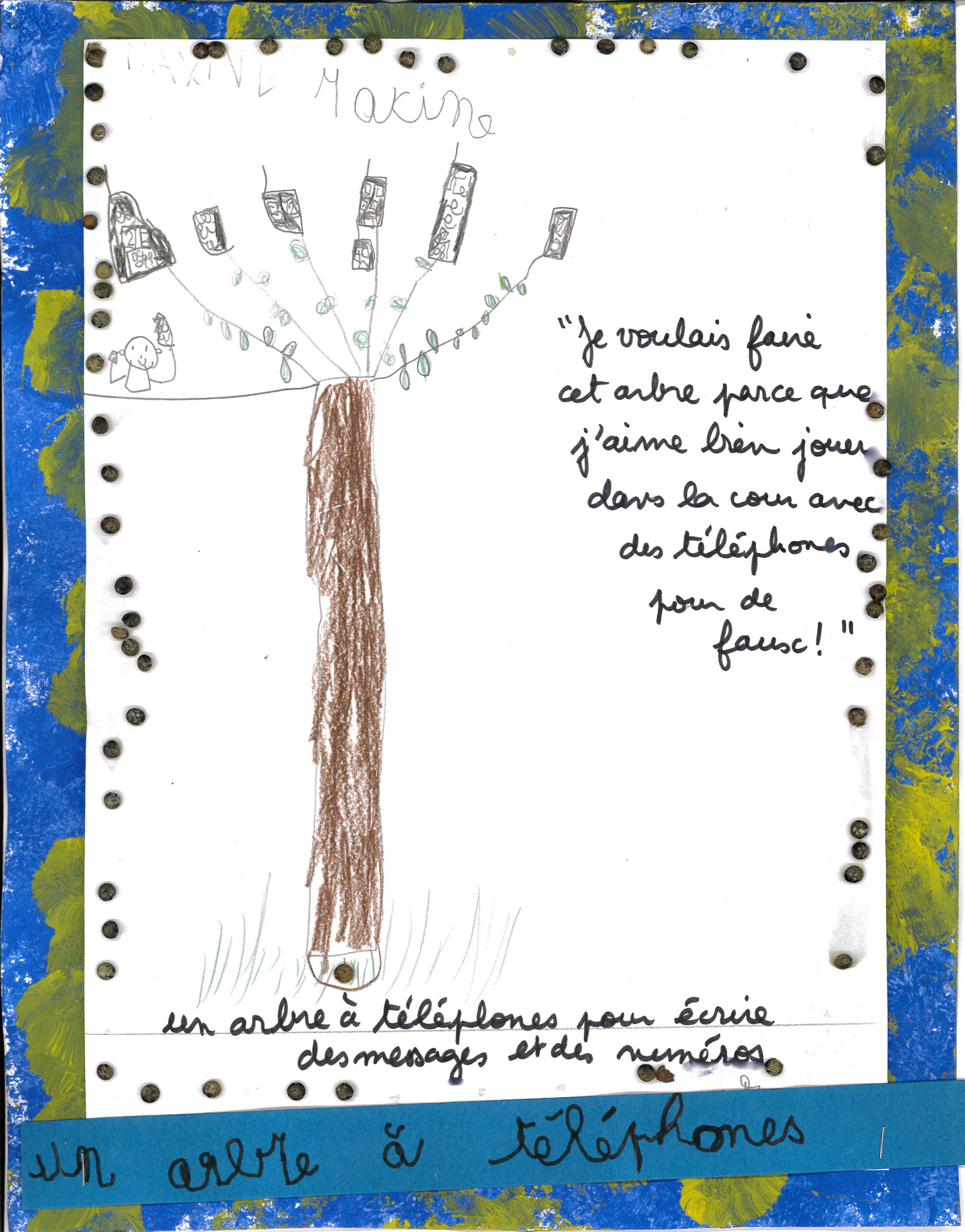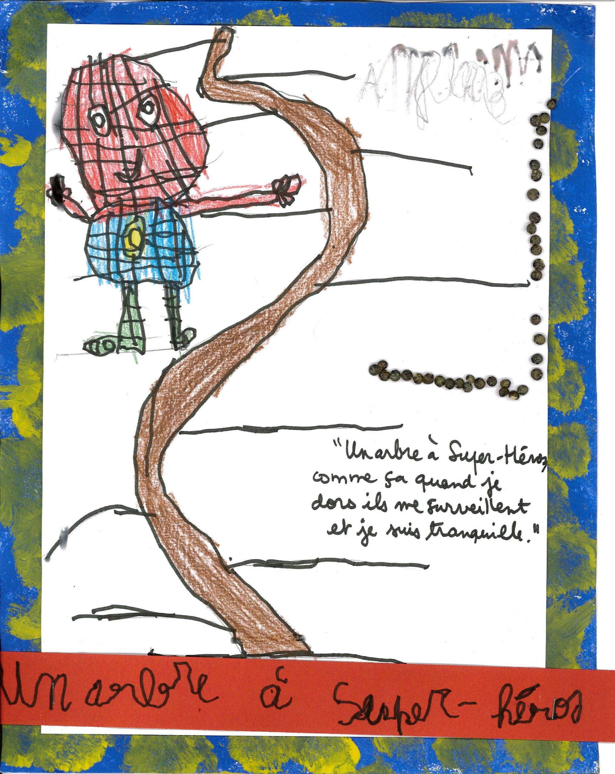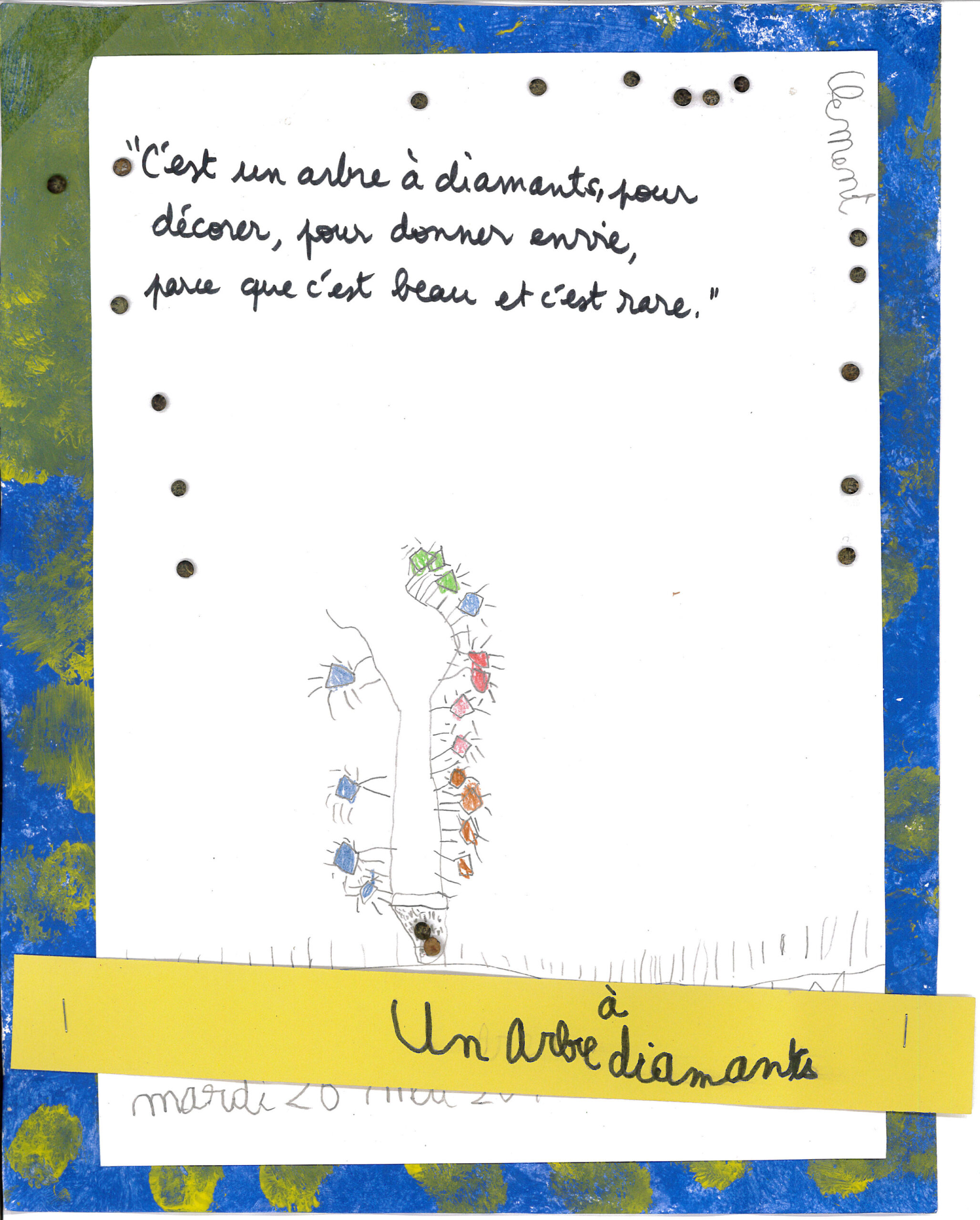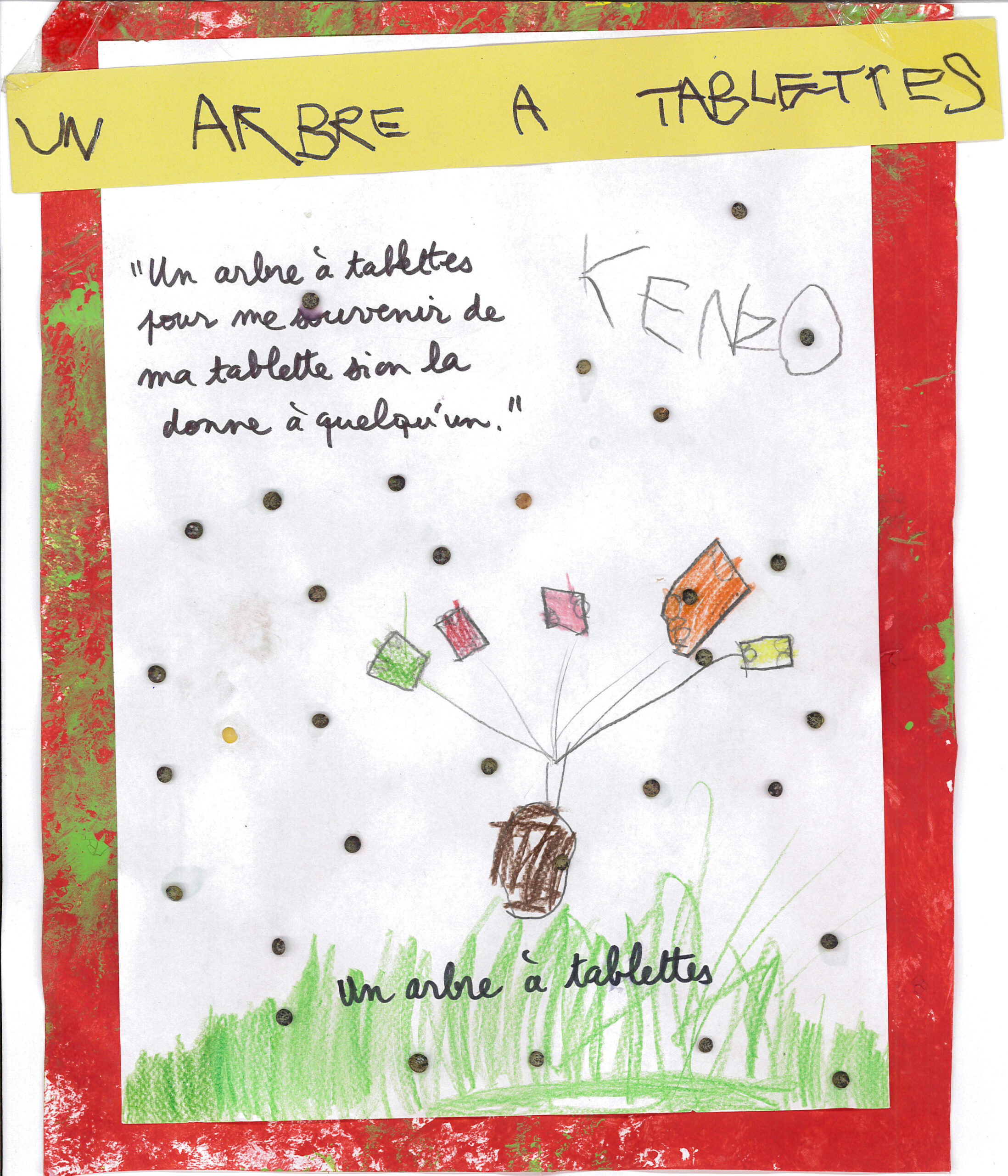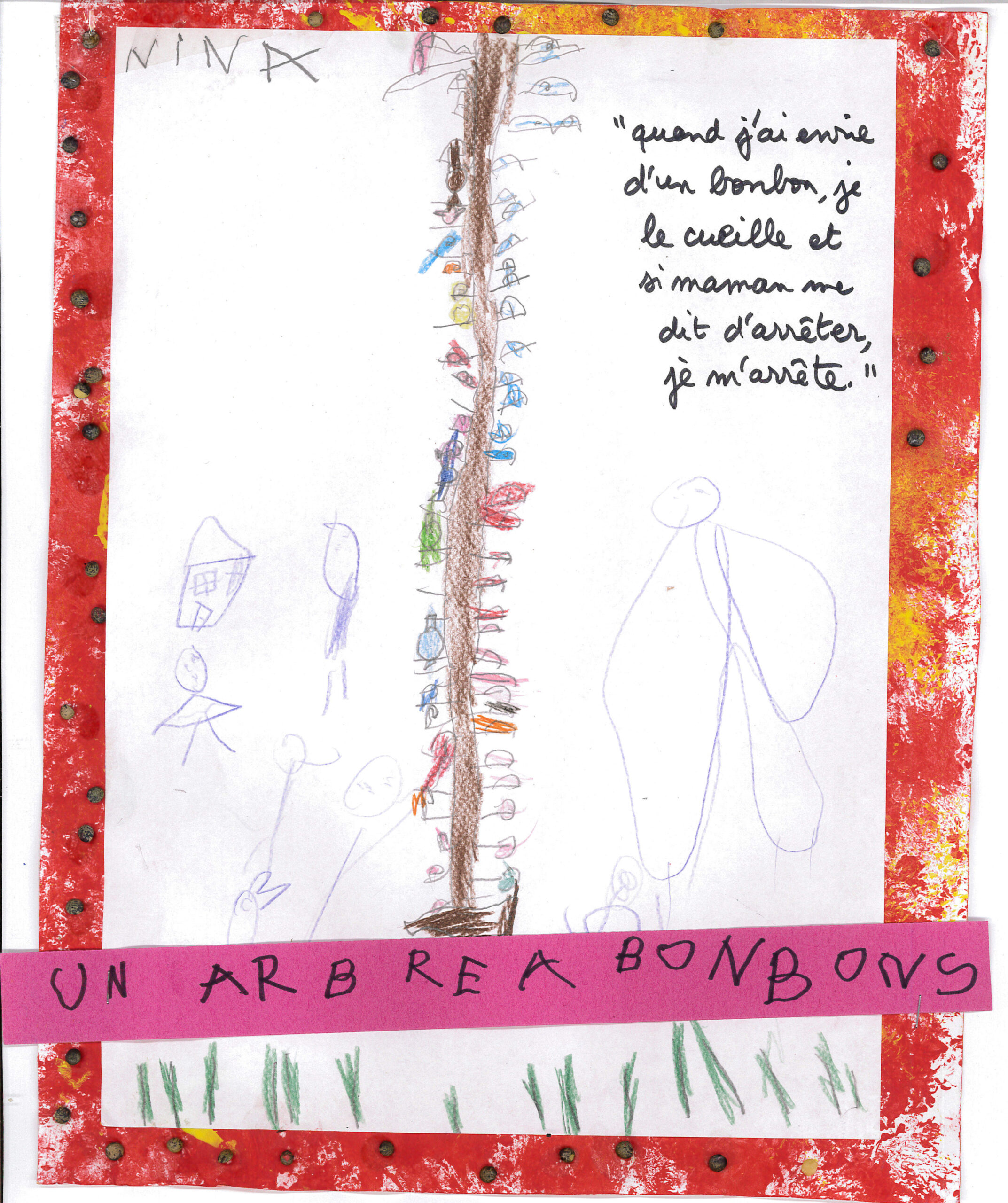 Monsieur découverts dans l’histoire du Chapeau à secrets, les enfants, accompagnés par Vanessa, ont tous inventé leur arbre à graines magiques. Au départ, ils ont eu du mal à sortir des sentiers battus par l’album et à s’autoriser l’invention de graines de leur choix. Mais après leur avoir glissé quelques idées, certains ont eu du mal à arrêter d’en planter ! Vanessa leur a fait dessiner leur idée, puis leur a demandé à chacun de donner un nom à leur création et d’expliquer leur arbre : informations qu’elle a soigneusement notées. Chaque enfant a pu recopier le nom de son arbre sur sa feuille et Vanessa y a retranscrit fidèlement leurs propos.