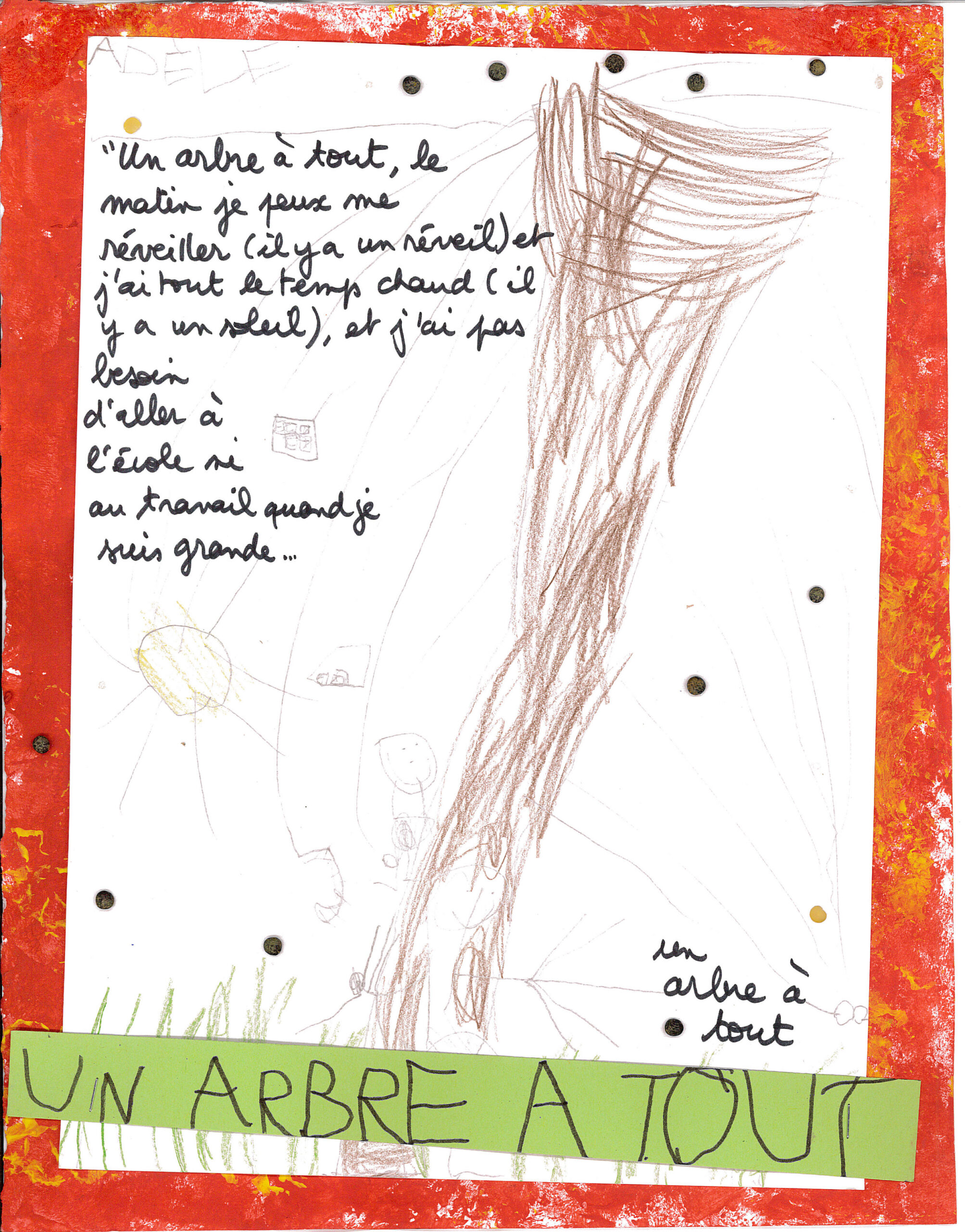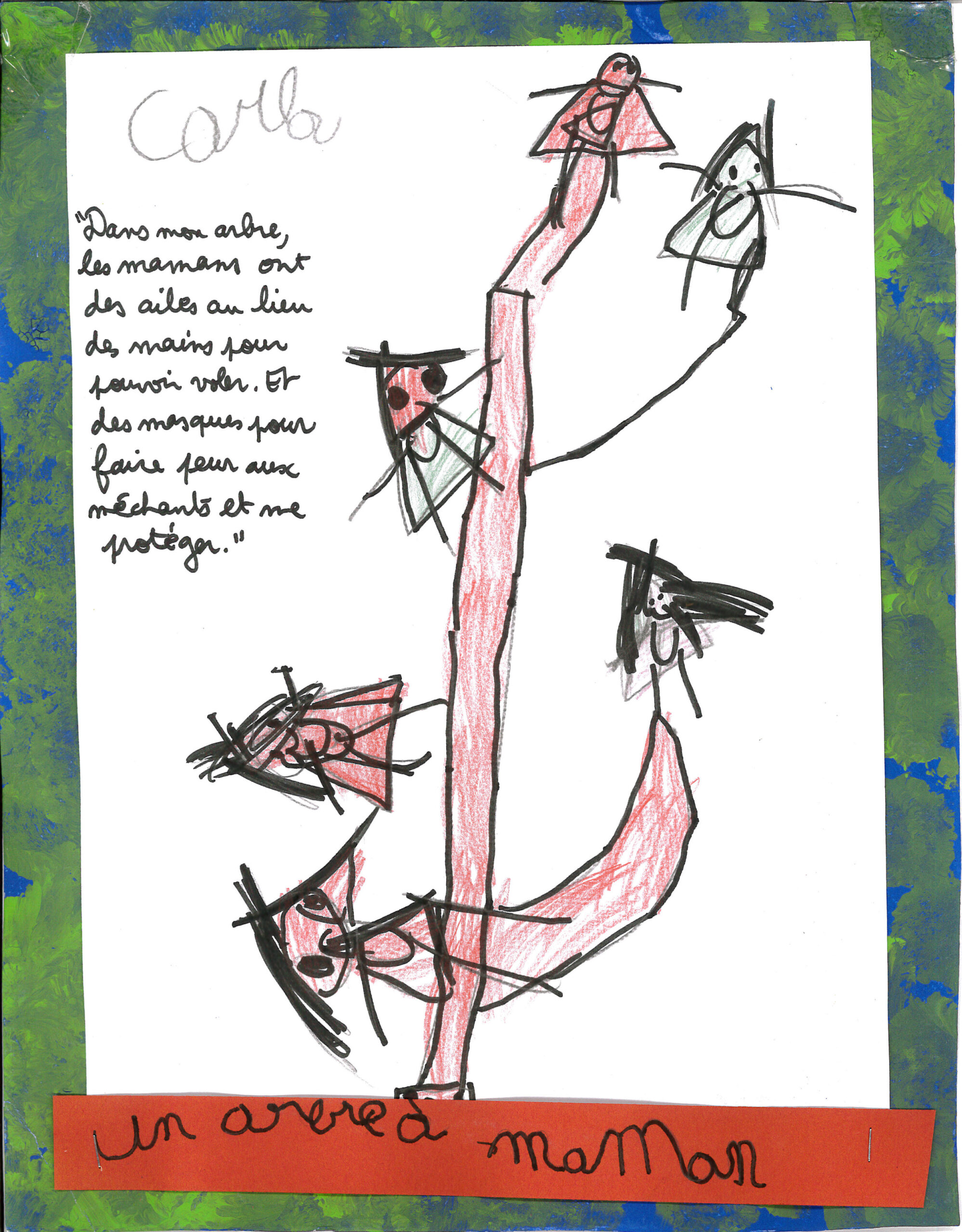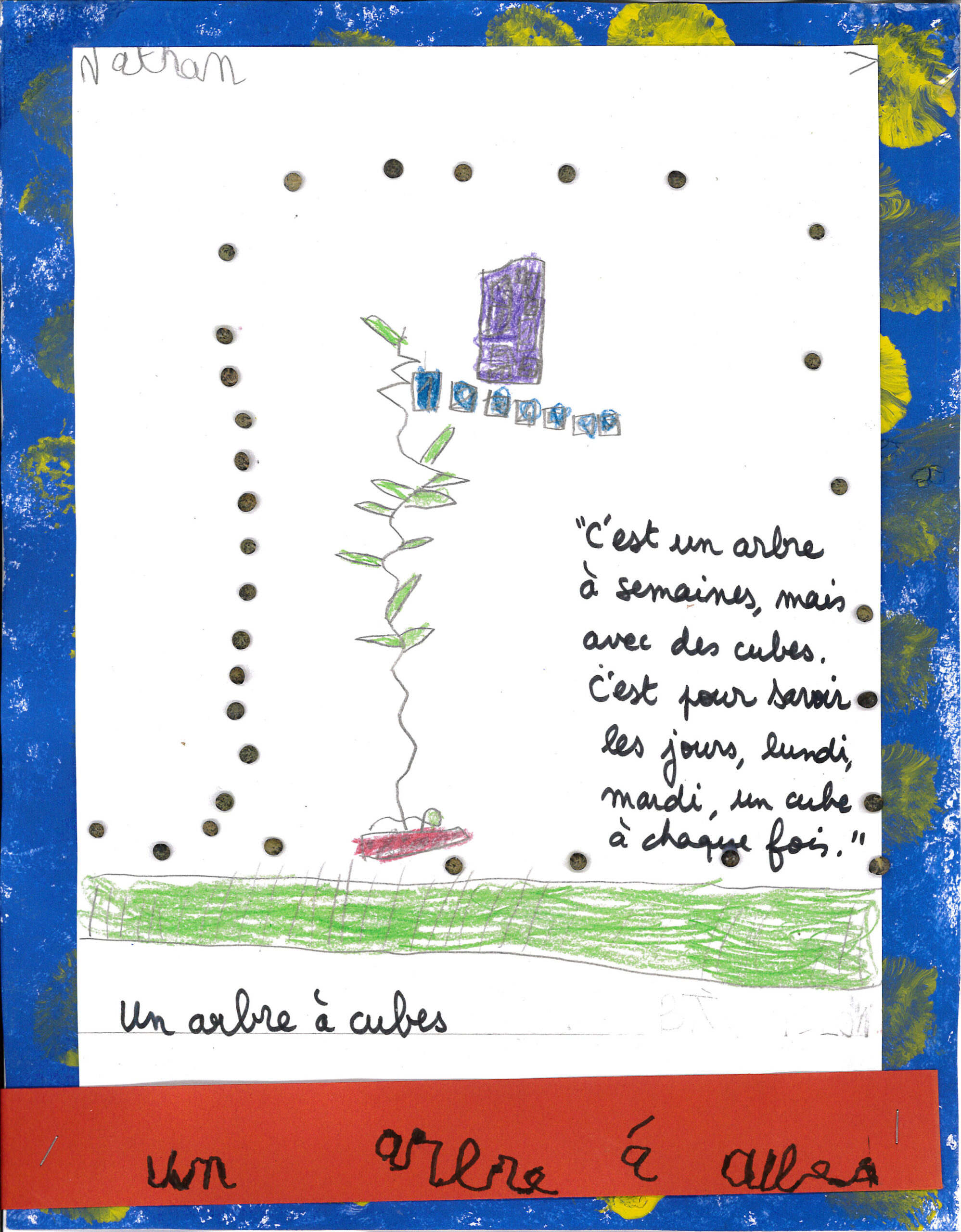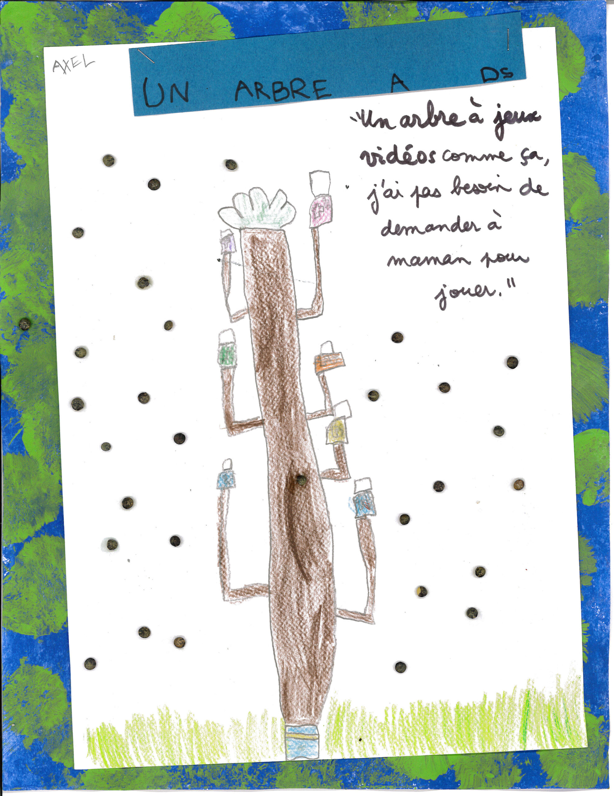 Monsieur découverts dans l’histoire du Chapeau à secrets, les enfants, accompagnés par Vanessa, ont tous inventé leur arbre à graines magiques. Au départ, ils ont eu du mal à sortir des sentiers battus par l’album et à s’autoriser l’invention de graines de leur choix. Mais après leur avoir glissé quelques idées, certains ont eu du mal à arrêter d’en planter ! Vanessa leur a fait dessiner leur idée, puis leur a demandé à chacun de donner un nom à leur création et d’expliquer leur arbre : informations qu’elle a soigneusement notées. Chaque enfant a pu recopier le nom de son arbre sur sa feuille et Vanessa y a retranscrit fidèlement leurs propos.