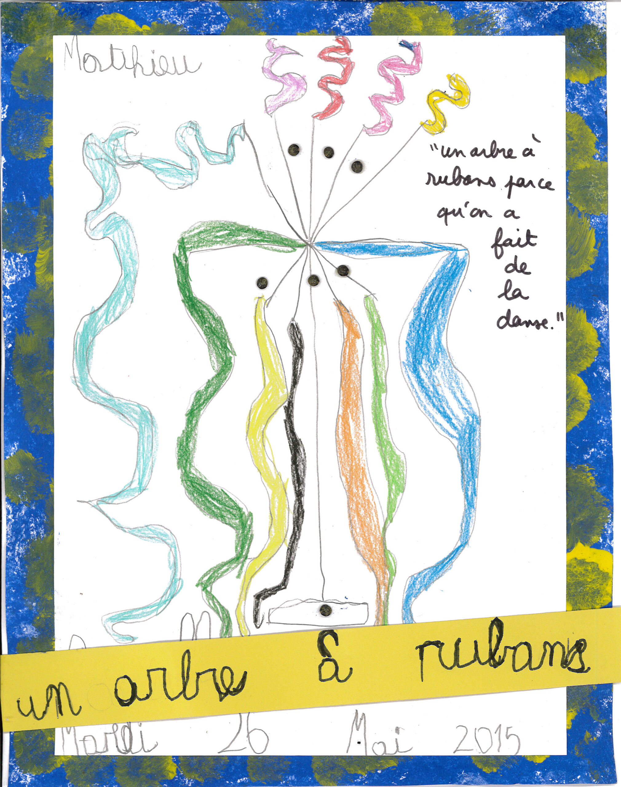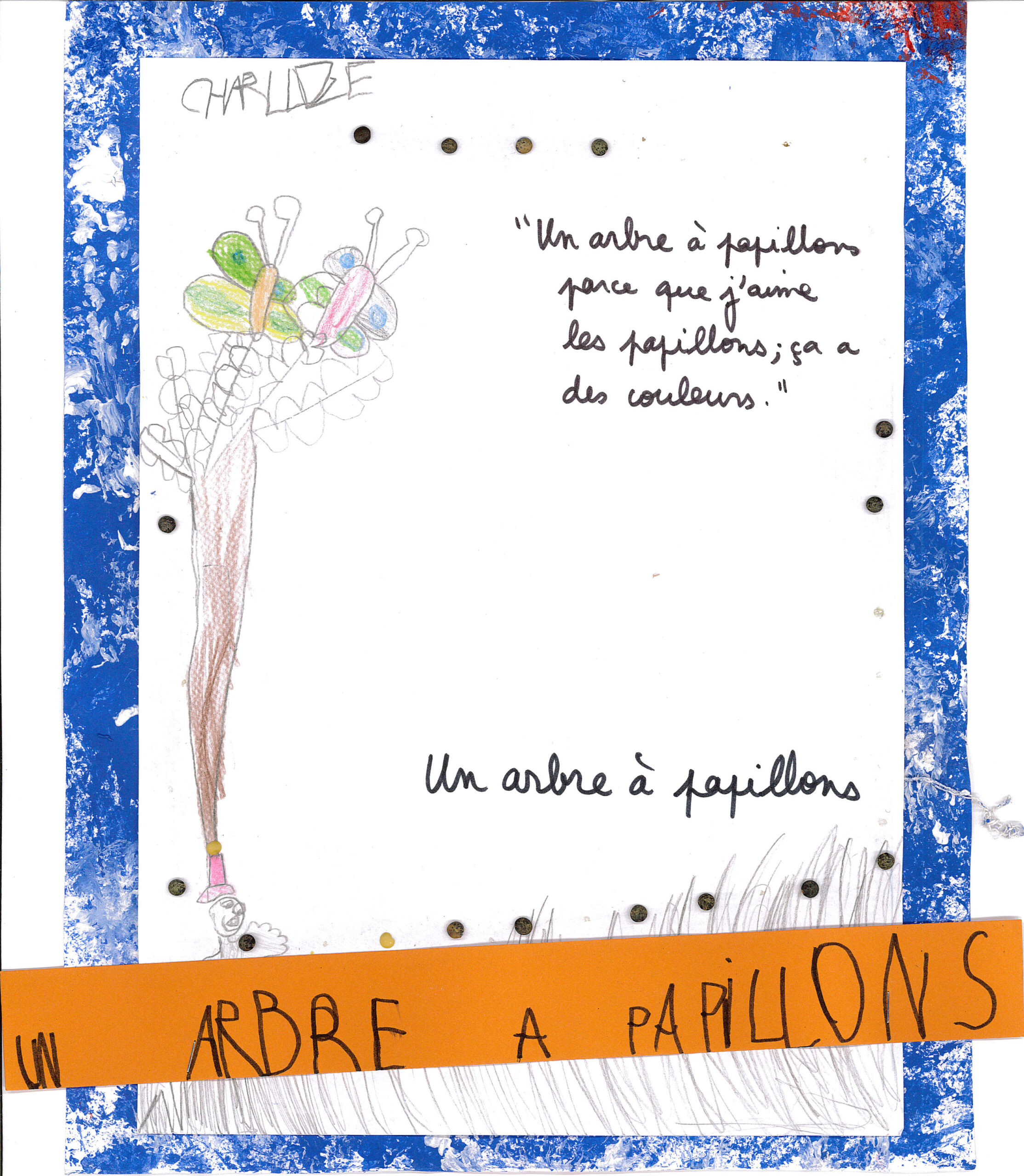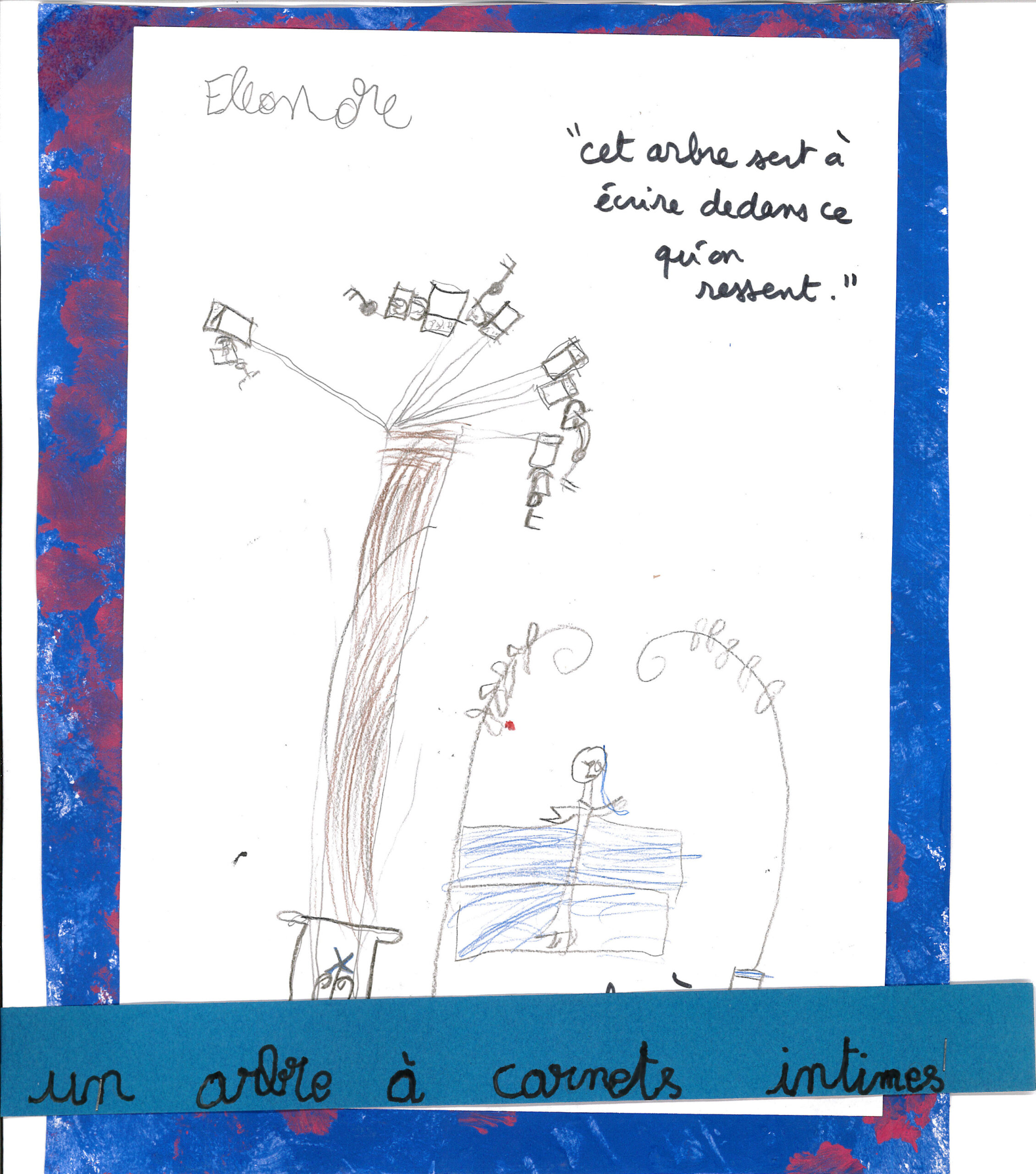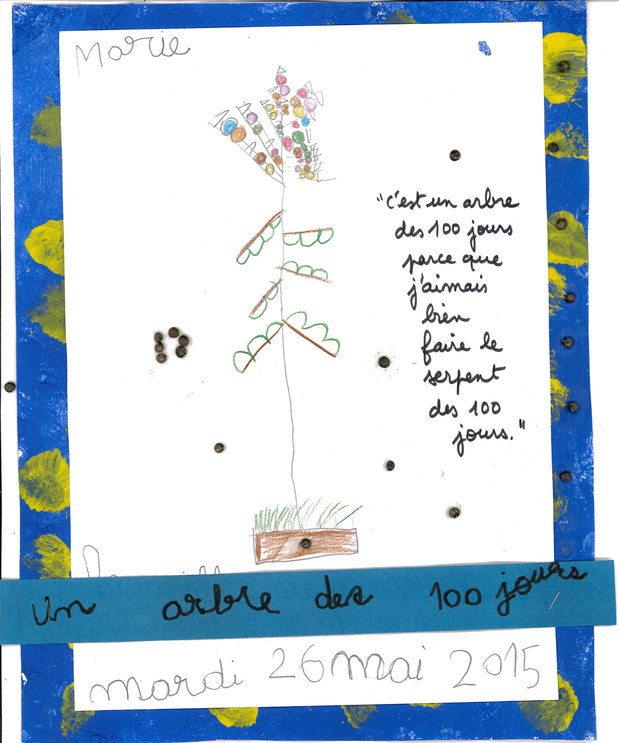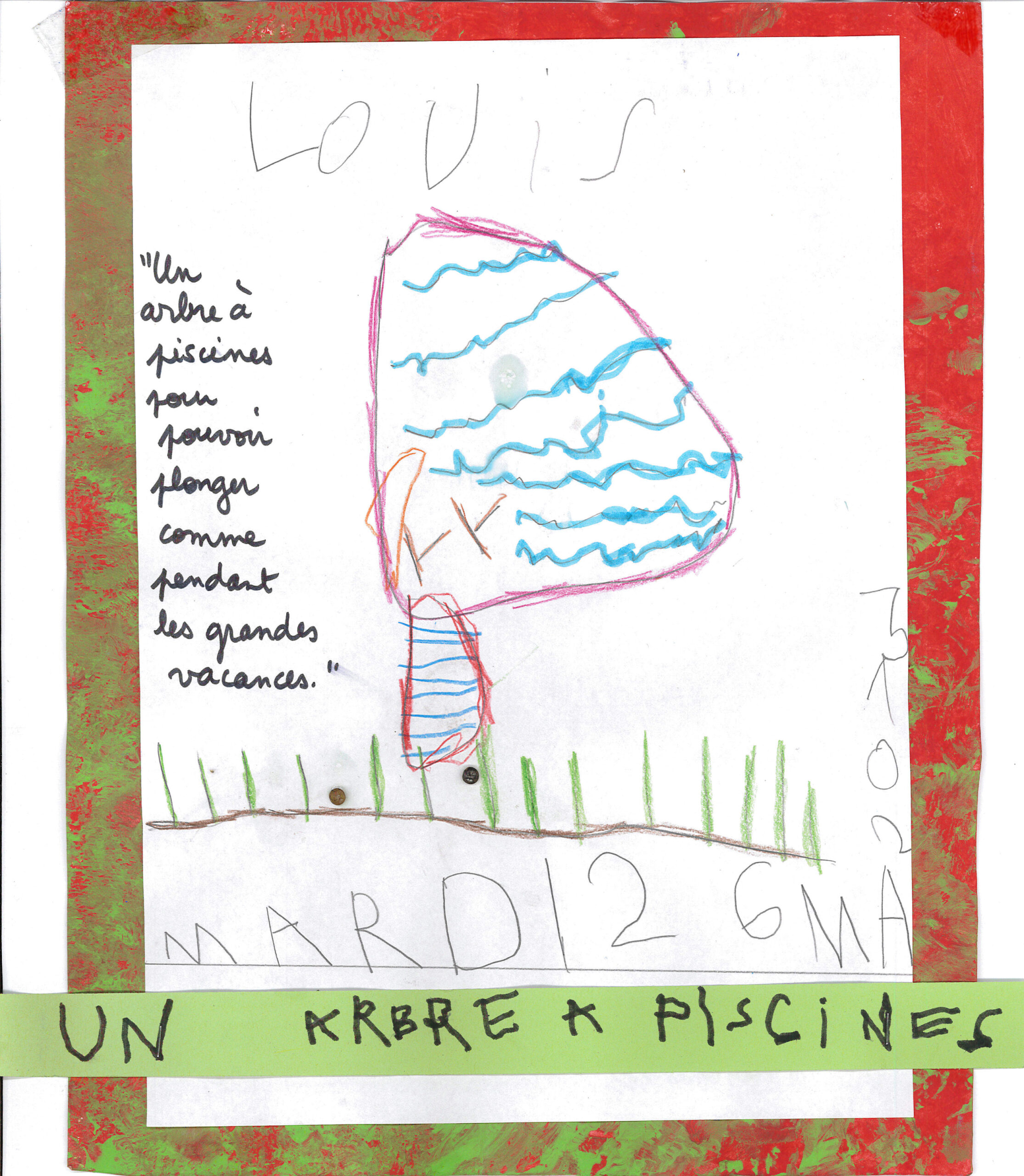 Monsieur découverts dans l’histoire du Chapeau à secrets, les enfants, accompagnés par Vanessa, ont tous inventé leur arbre à graines magiques. Au départ, ils ont eu du mal à sortir des sentiers battus par l’album et à s’autoriser l’invention de graines de leur choix. Mais après leur avoir glissé quelques idées, certains ont eu du mal à arrêter d’en planter ! Vanessa leur a fait dessiner leur idée, puis leur a demandé à chacun de donner un nom à leur création et d’expliquer leur arbre : informations qu’elle a soigneusement notées. Chaque enfant a pu recopier le nom de son arbre sur sa feuille et Vanessa y a retranscrit fidèlement leurs propos.