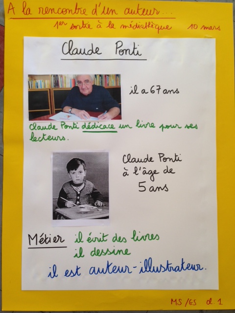 De retour à l’école et les jours qui ont suivi, Vanessa a repris avec les enfants tous les éléments évoqués lors de la visite à la médiathèque. Elle a réalisé de grandes affiches (sur papier jaune poussin !) avec images et textes des enfants (dictée à l’adulte) pour que tout reste frais et à disposition des enfants dans la classe, et qu’ils puissent à leur tour les montrer à leurs parents et en discuter.