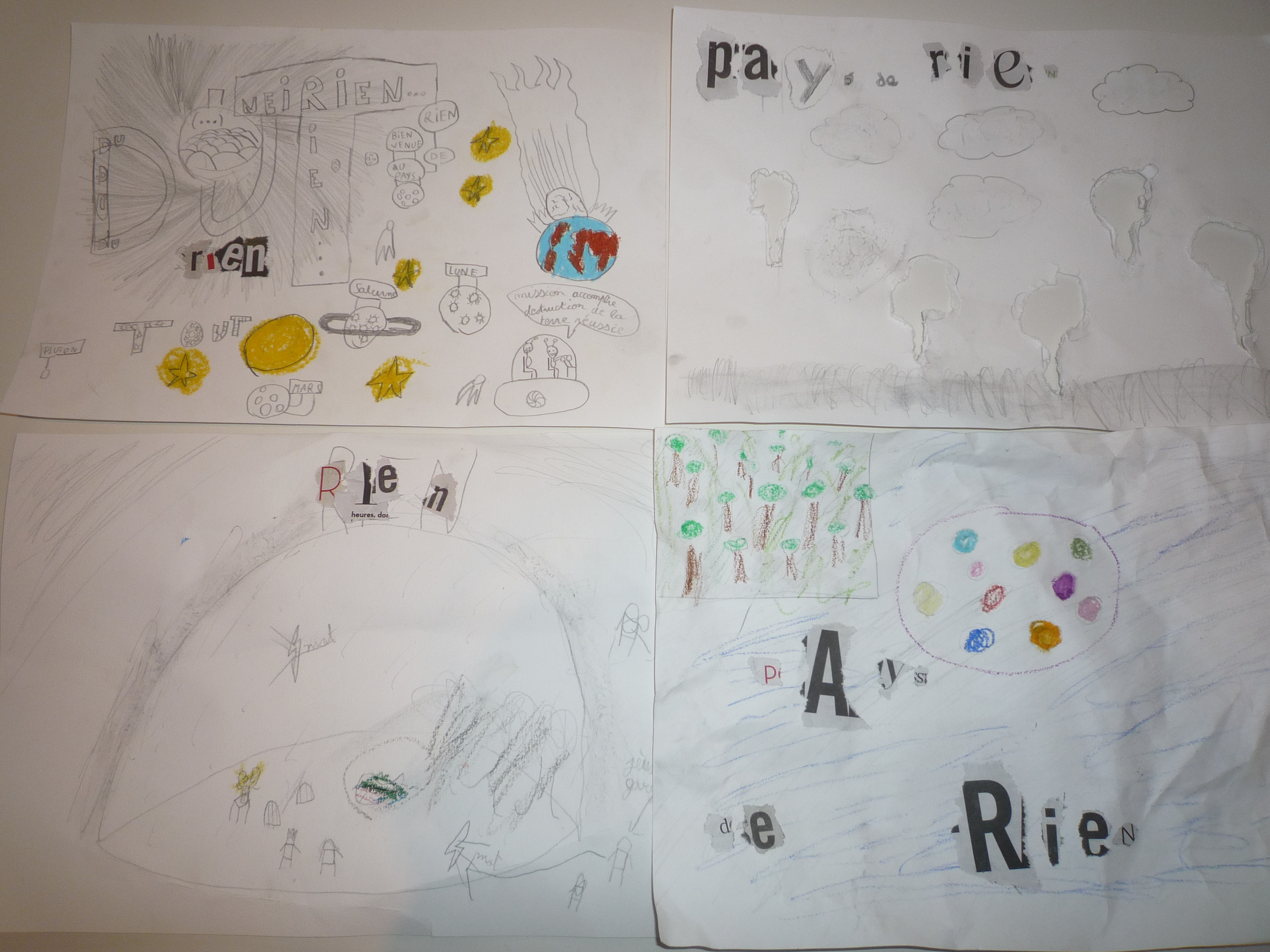 Avant d’aller à la rencontre du texte , nous avons d’abord explorer ce que le « rien » signifiait pour nous en le comparant avec le « tout »: en théâtre, se présenter sans rien montrer et en montant quelque chose de soi même … observer une personne qui fait beaucoup et une personne qui ne fait rien sur scène . Dessiner « tout » ce qu’il y a sur terre, dans le ciel et sous la mer , dessiner la guerre avant qu’elle s’achève …