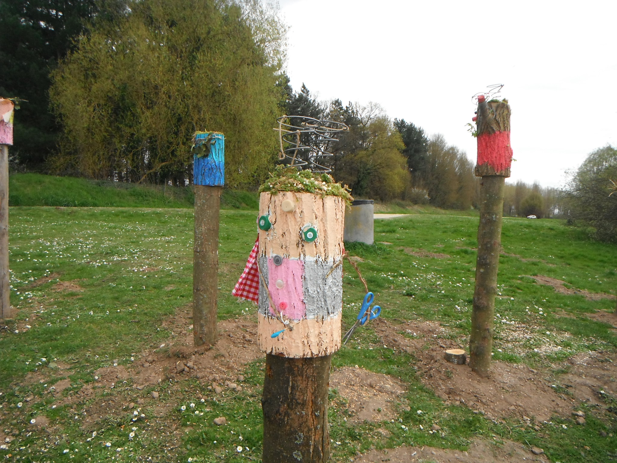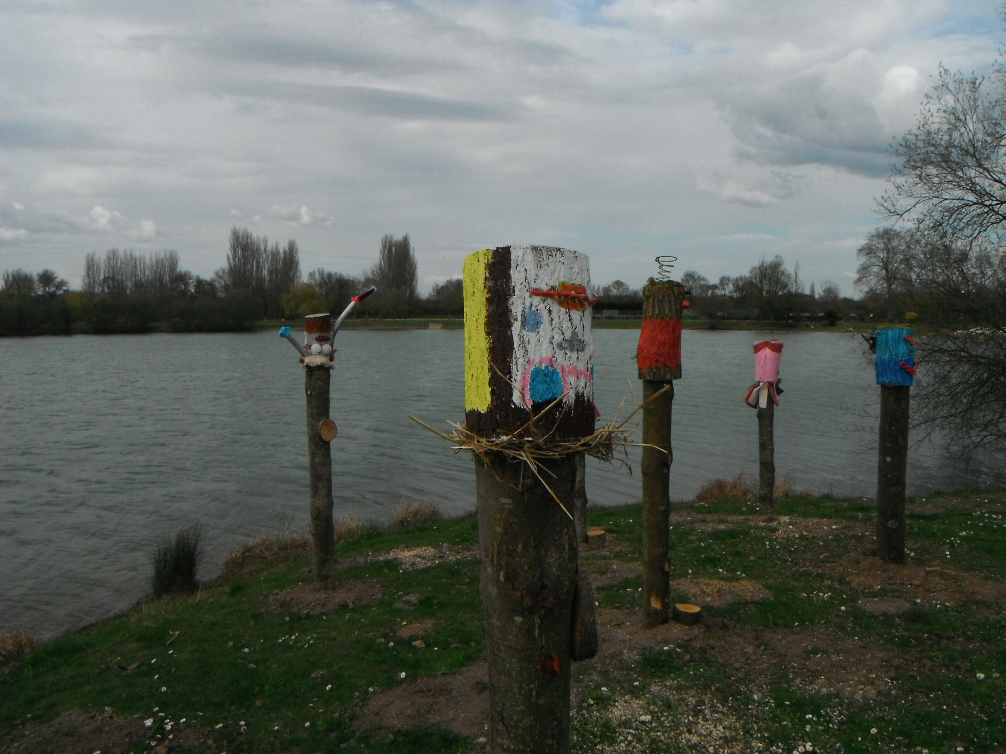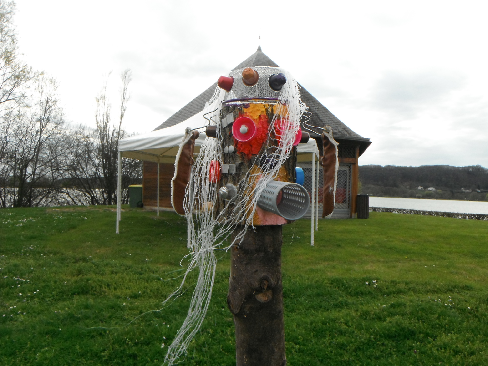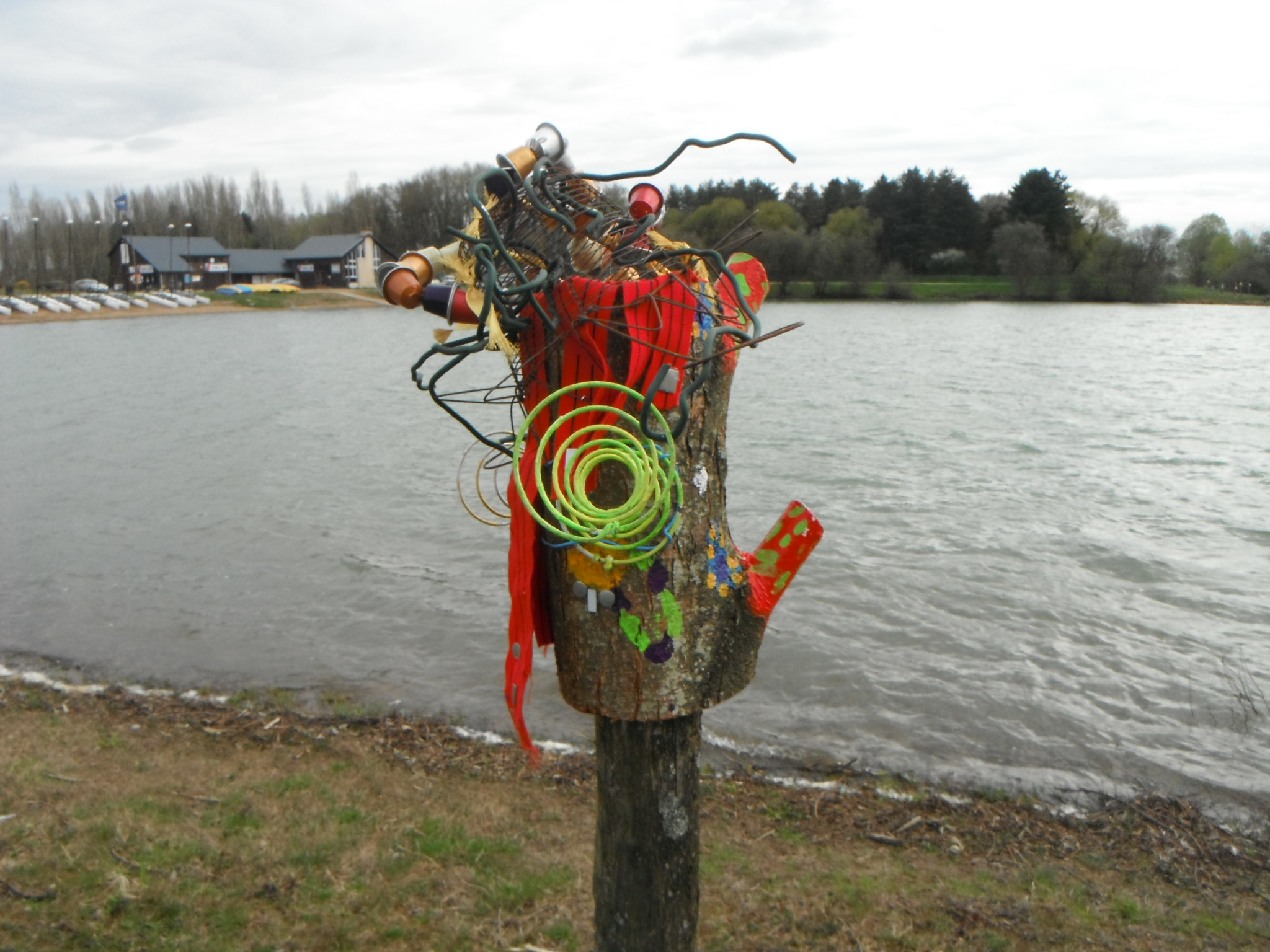 C’est assez facile. Il faut juste des rondins de bois de 2 mètres de long (comme on en voit en tas réguliers dans la forêt voisine.) Rondins dont on fait séparer un morceau de 50 cm. Ensuite il faut: 1 demander aux parents de vieilles choses dont ils n’ont plus besoin, ou dont ils ne savent pas encore qu’ils n’en ont plus besoin. (Passoires, moules à gâteau, tuyaux, écumoires…) Les porter à l’école. 2 Travailler une tête de totem en ajoutant, coulant, fixant, agrafant, peignant, grattant, repeignant,et laisser sécher. 3 Demander aux CM2 d’inventer quelques villages de Totems, avec leur histoire. 4 Avec l’aide d’adultes consentants, faire planter les rondins au bord du lac comme on veut, faire ajuster les têtes des totems sur leurs corps.