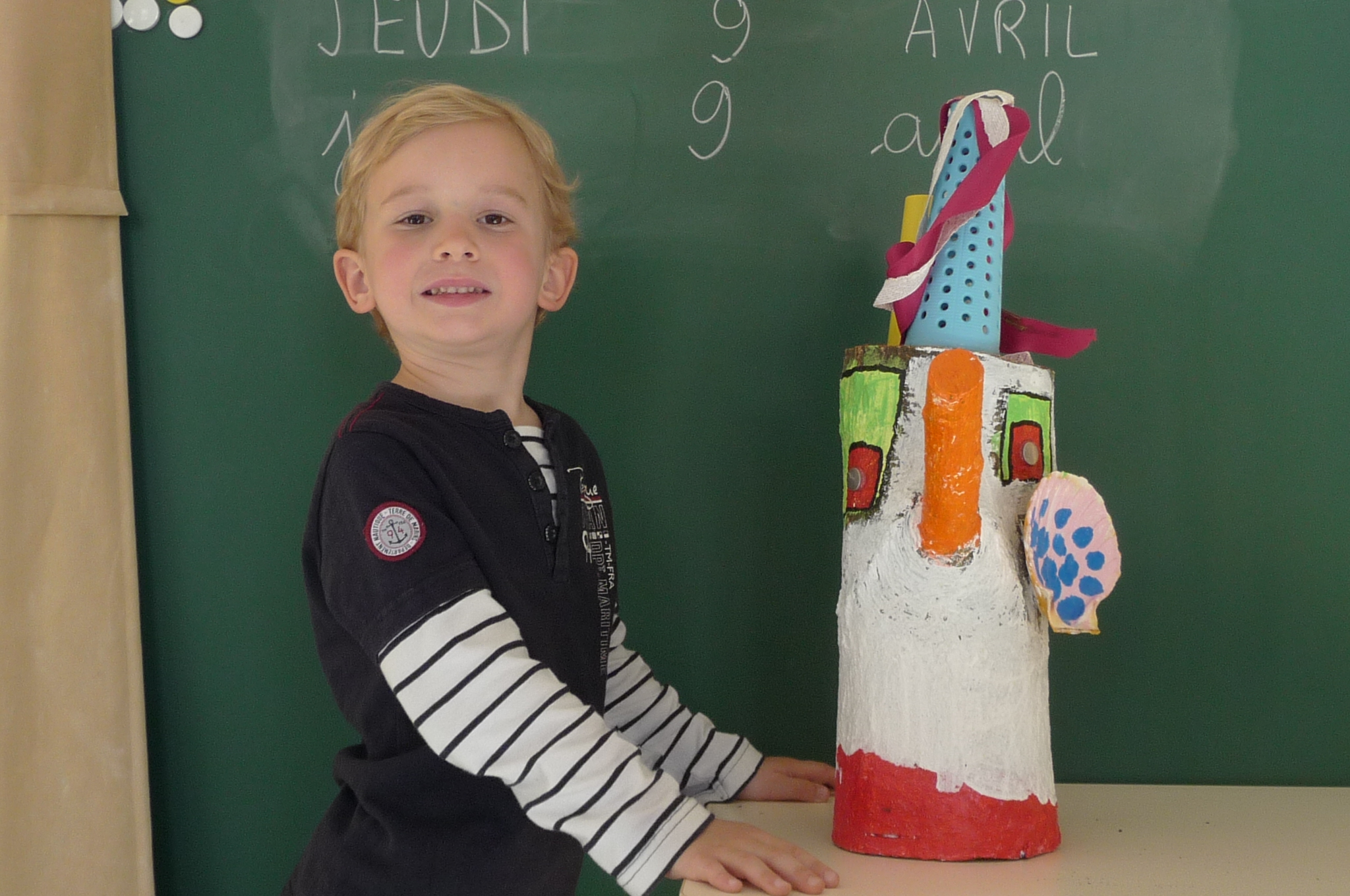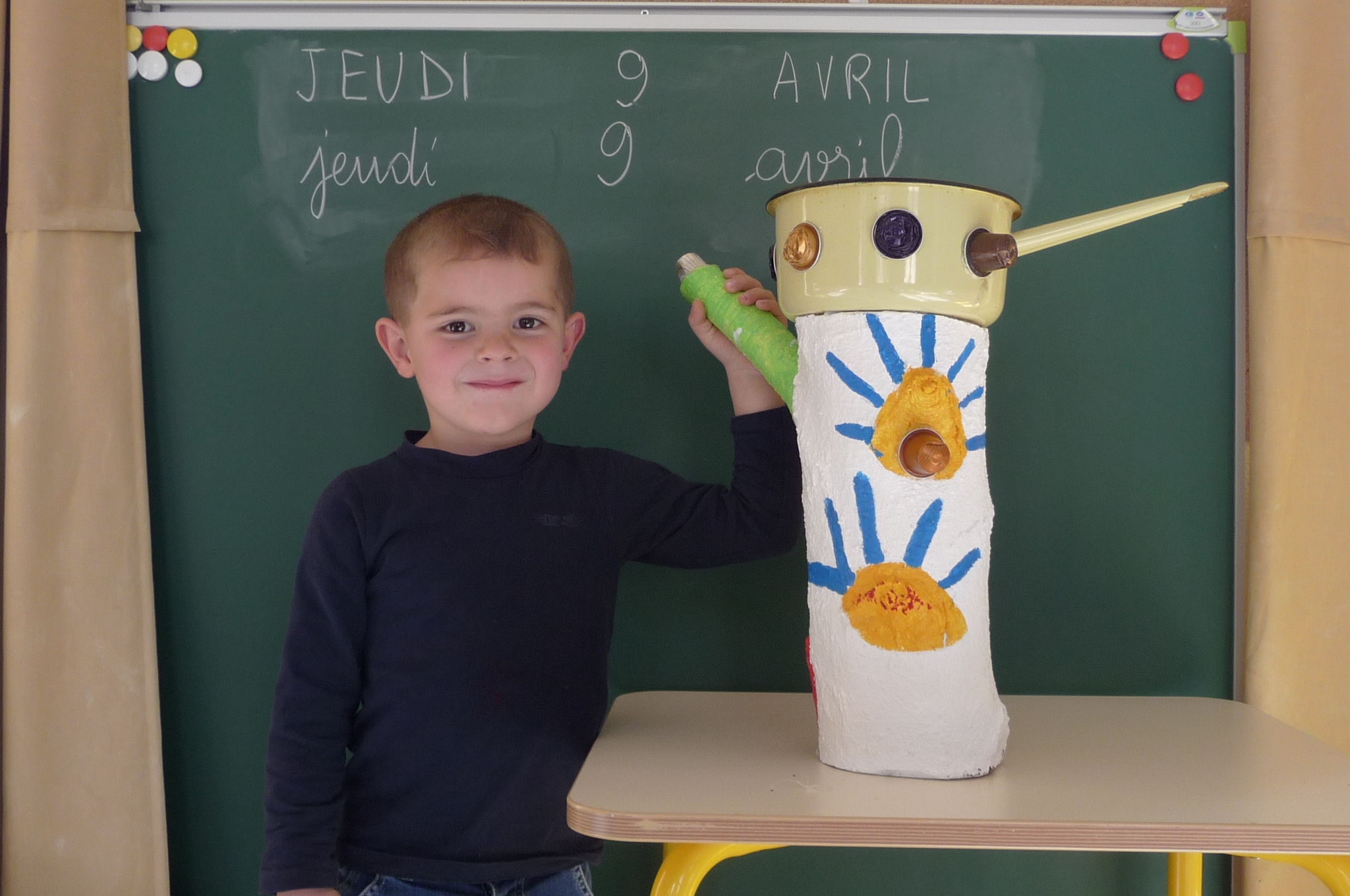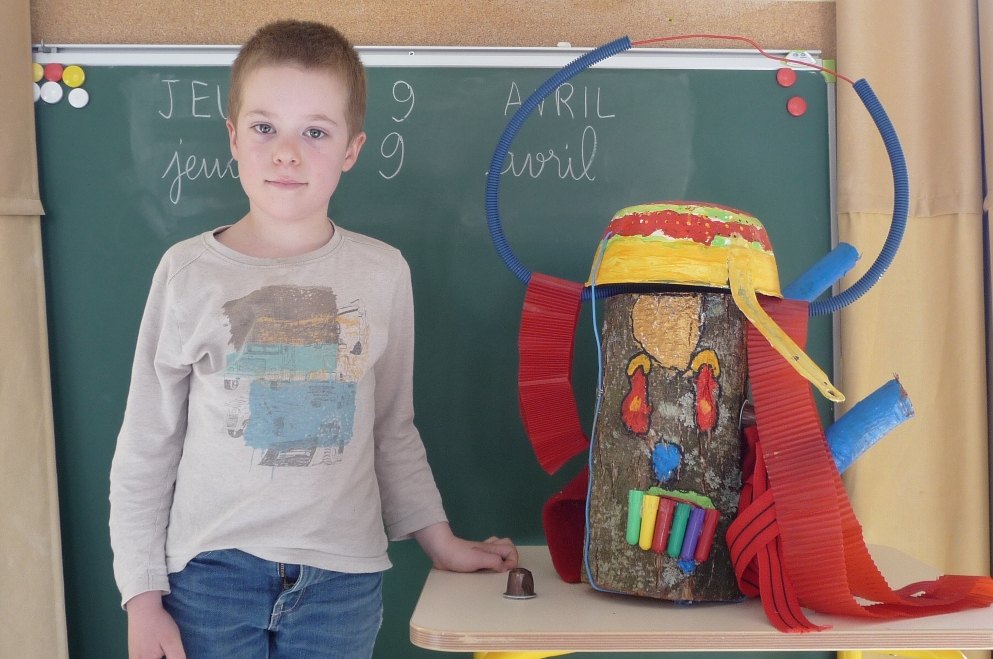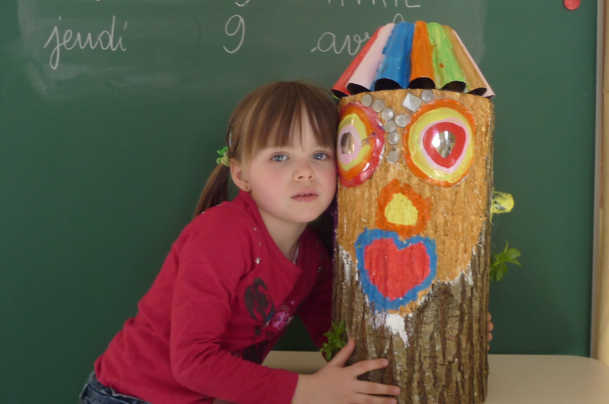 C’est assez facile. Il faut juste des rondins de bois de 2 mètres de long (comme on en voit en tas réguliers dans la forêt voisine.) Rondins dont on fait séparer un morceau de 50 cm. Ensuite il faut: 1 demander aux parents de vieilles choses dont ils n’ont plus besoin, ou dont ils ne savent pas encore qu’ils n’en ont plus besoin. (Passoires, moules à gâteau, tuyaux, écumoires…) Les porter à l’école. 2 Travailler une tête de totem en ajoutant, coulant, fixant, agrafant, peignant, grattant, repeignant,et laisser sécher. 3 Demander aux CM2 d’inventer quelques villages de Totems, avec leur histoire. 4 Avec l’aide d’adultes consentants, faire planter les rondins au bord du lac comme on veut, faire ajuster les têtes des totems sur leurs corps.