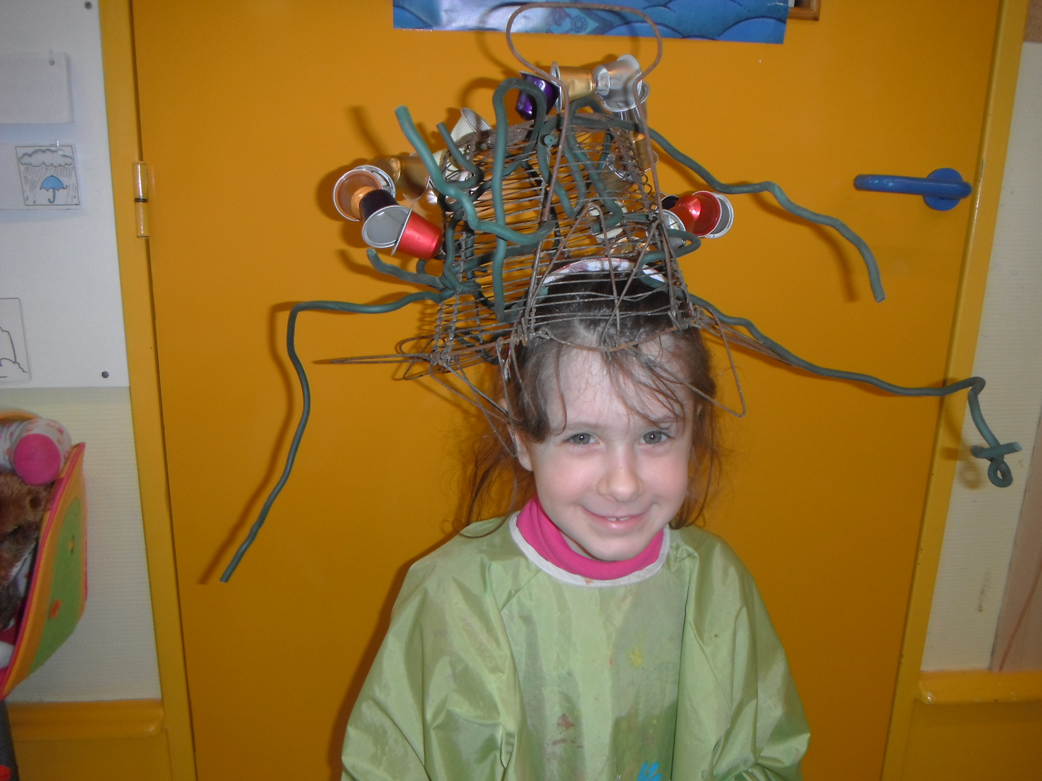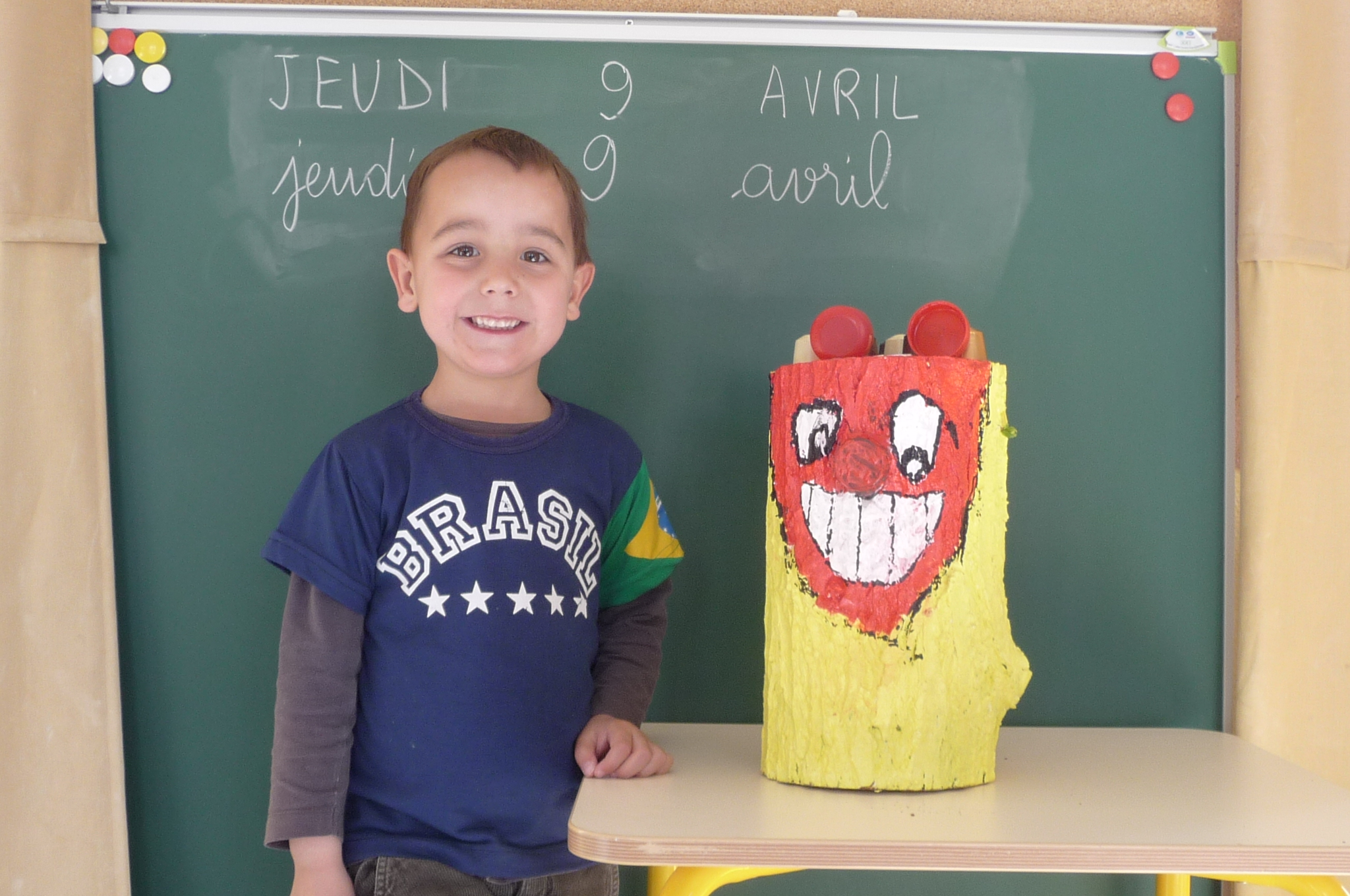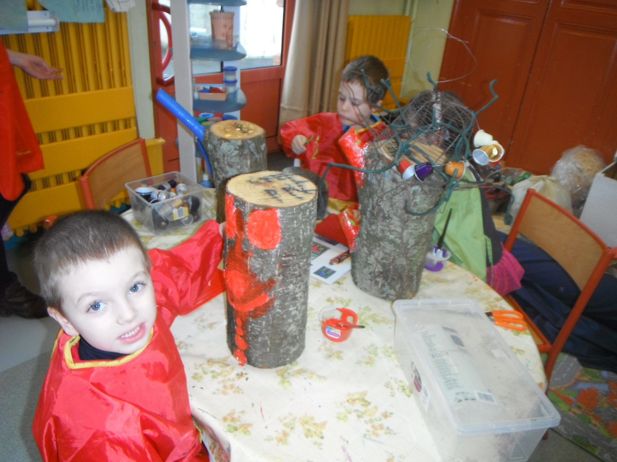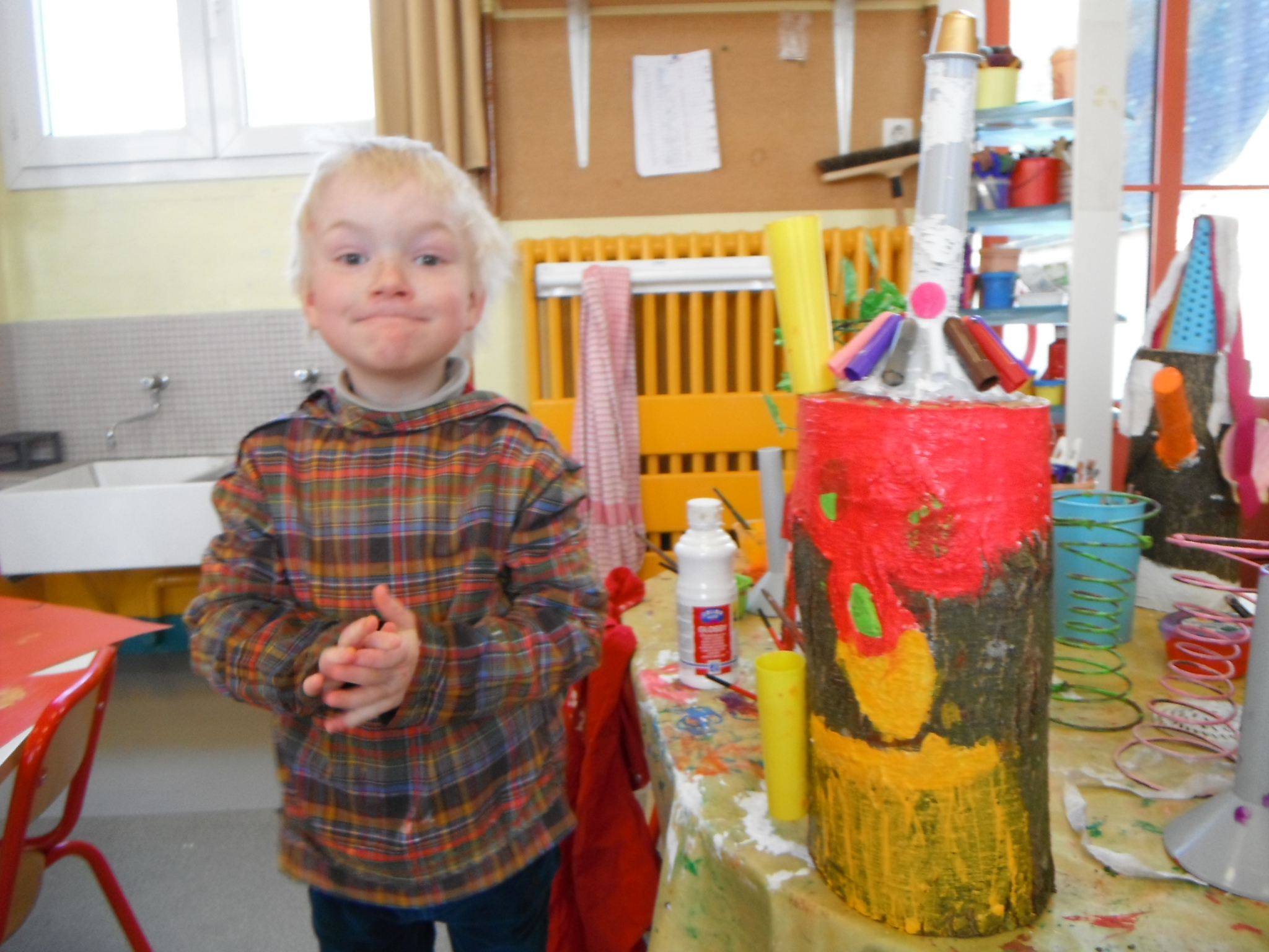 C’est assez facile. Il faut juste des rondins de bois de 2 mètres de long (comme on en voit en tas réguliers dans la forêt voisine.) Rondins dont on fait séparer un morceau de 50 cm. Ensuite il faut: 1 demander aux parents de vieilles choses dont ils n’ont plus besoin, ou dont ils ne savent pas encore qu’ils n’en ont plus besoin. (Passoires, moules à gâteau, tuyaux, écumoires…) Les porter à l’école. 2 Travailler une tête de totem en ajoutant, coulant, fixant, agrafant, peignant, grattant, repeignant,et laisser sécher. 3 Demander aux CM2 d’inventer quelques villages de Totems, avec leur histoire. 4 Avec l’aide d’adultes consentants, faire planter les rondins au bord du lac comme on veut, faire ajuster les têtes des totems sur leurs corps.