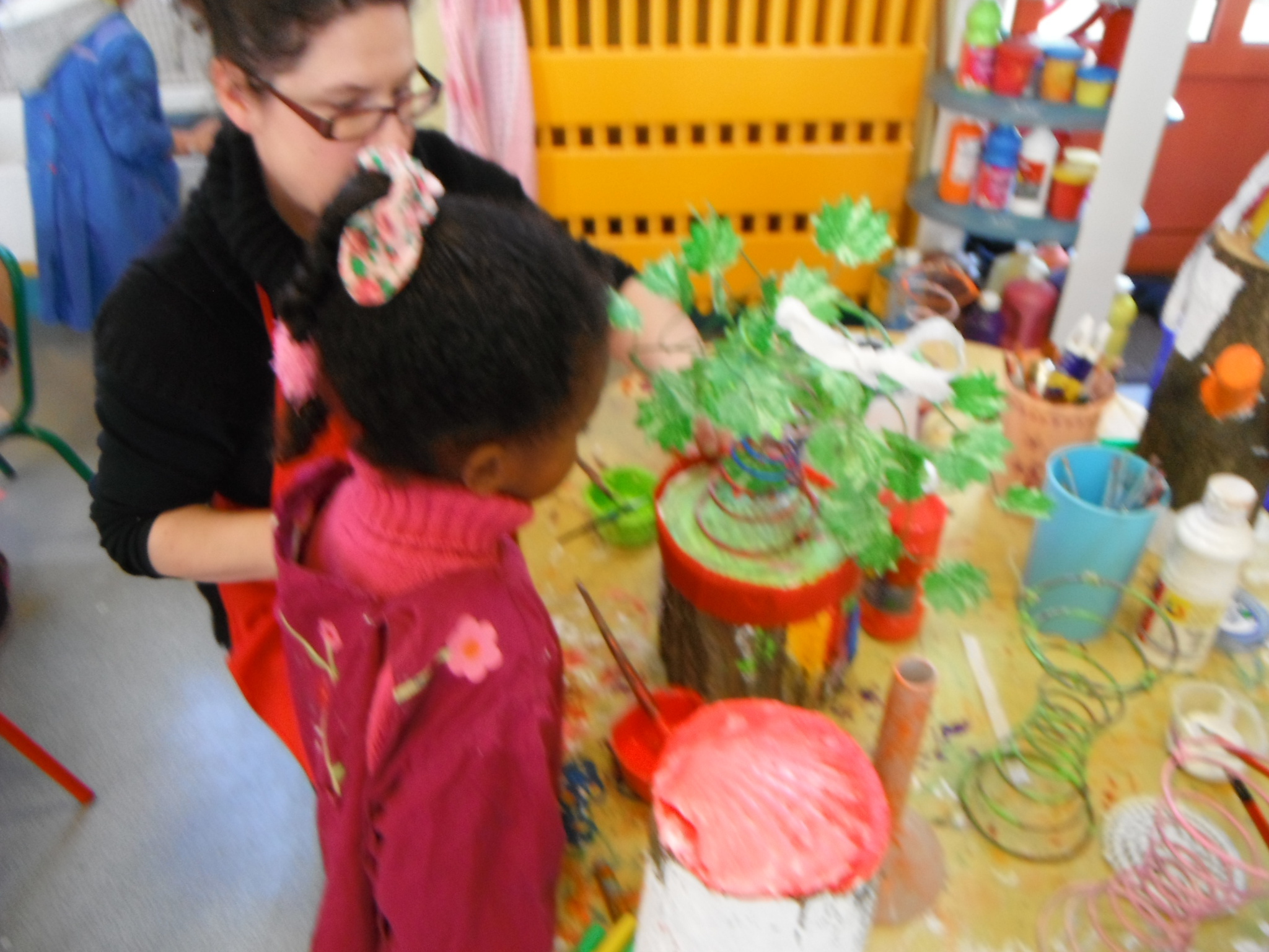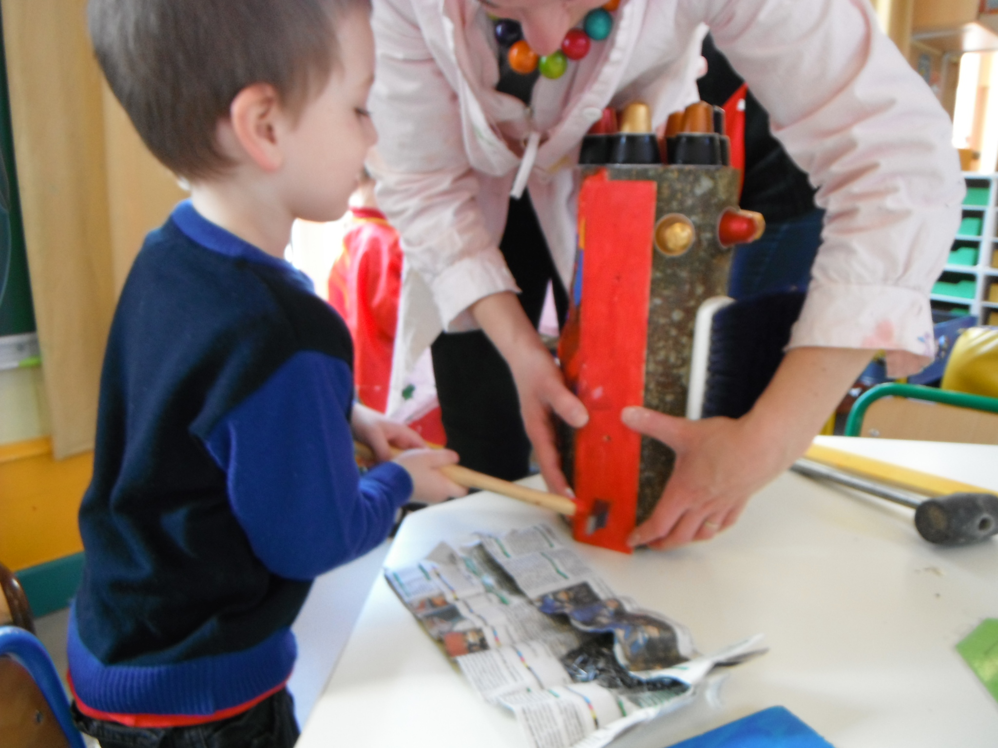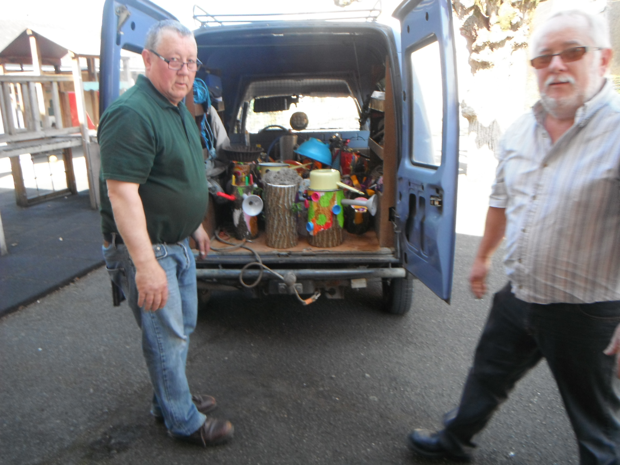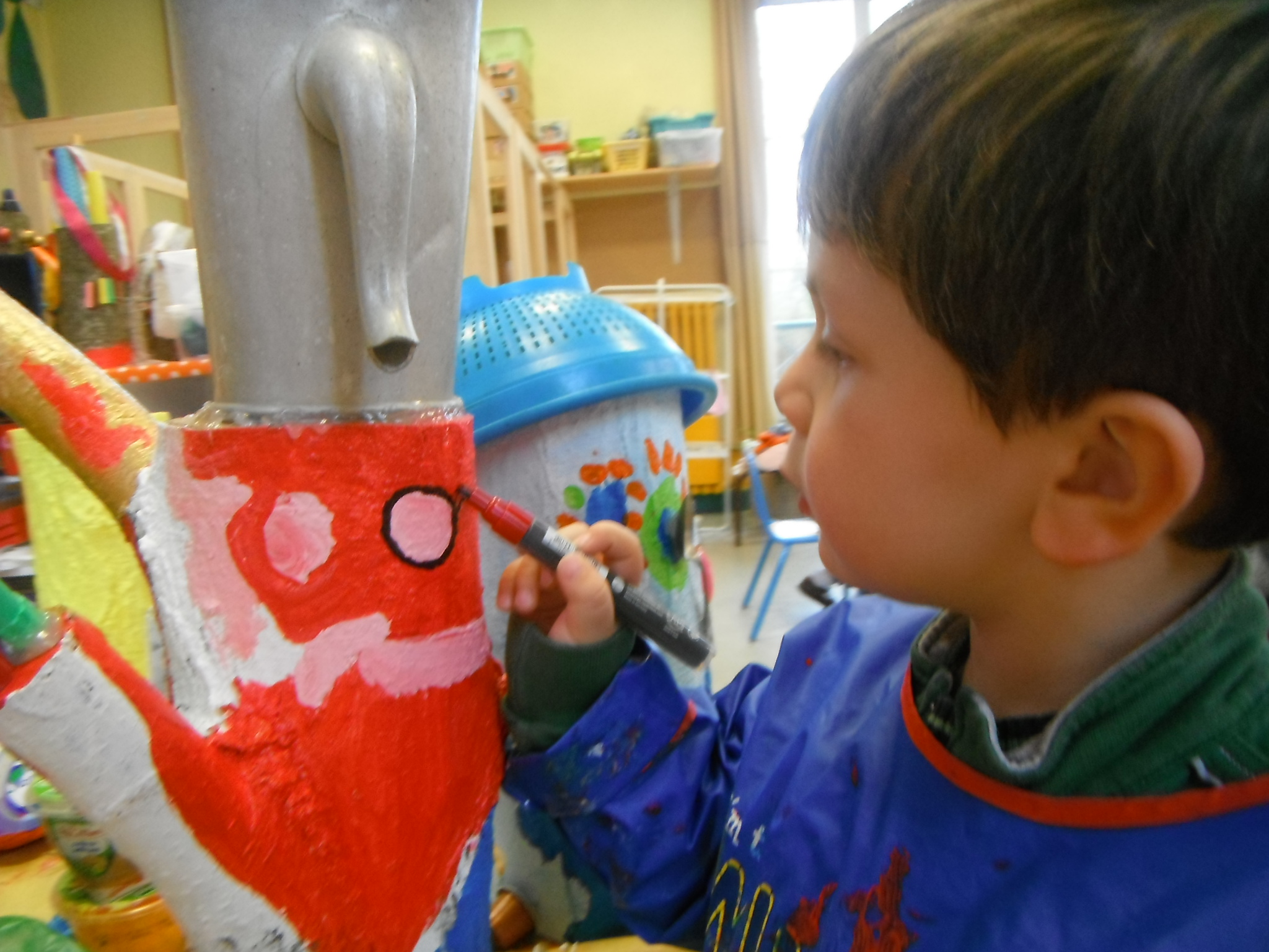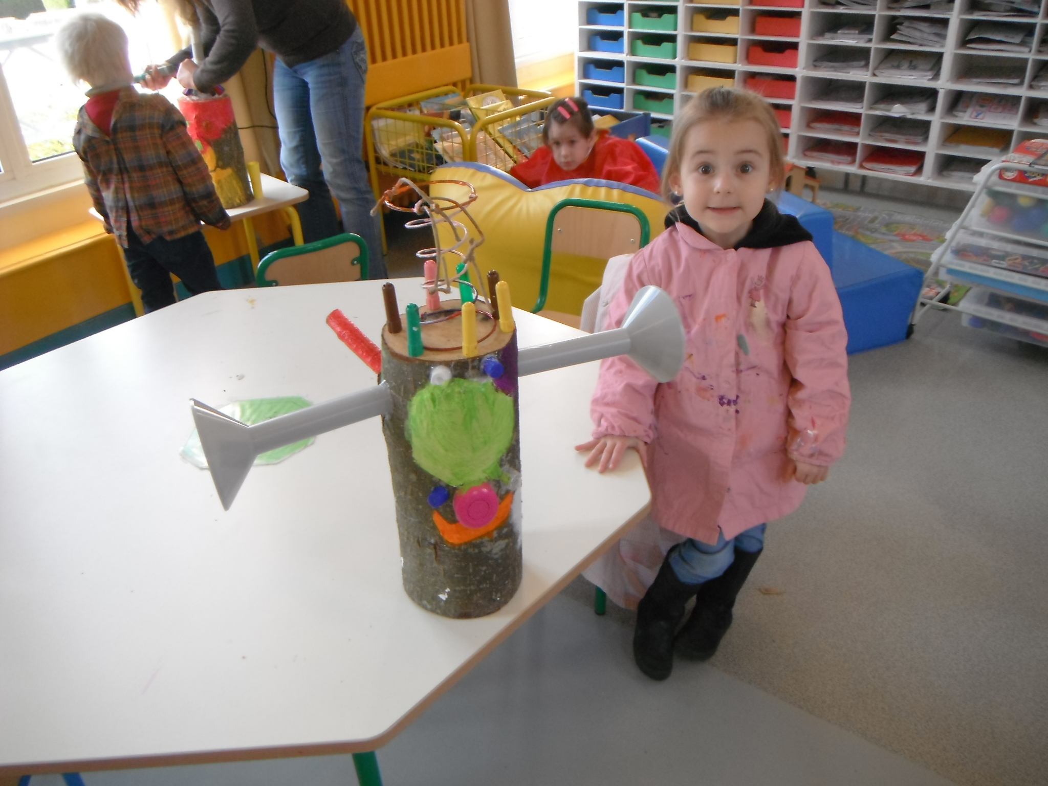 Les familles, amis ont apporté des trésors. Les enfants ont choisi dans les caisses, ont fait des essais et se sont décidés rapidement. Ils avaient en général des idées catégoriques. Tout le monde a aidé à fixer: parents, stagiaires, aides, enfants apportant leurs idées, outils et savoir-faire.