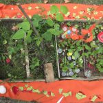 Ils récoltent des petits trésors : une fleur séchée, une belle feuille, un joli caillou qui deviendra montagne ou rocher, une petite branche qui deviendra arbre, des matériaux comme de la mousse, de la pierre, du sable, à propos desquels on peut mettre des mots : doux, durs lisse, piquant, mou. Ils apportent des petits jouets : Playmobils, voitures, animaux qui sortent de leur chambre pour prendre vie dans leurs jardins.