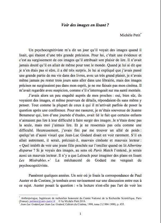 Michèle Petit pose une question passionnante : Nous « faisons nous tous un film » lorsque nous lisons , ou dit autrement élaborons nous tous des images mentales lorsque nous lisons ? Le texte de Michèle Petit nous interroge sur nos diverses manières de lire un texte et d’être touché par ce texte.