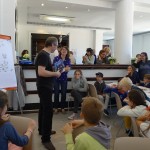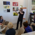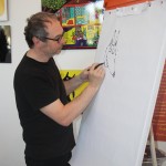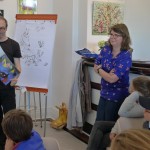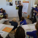 Puis, Alan Mets a raconté l'une de ses histoires ("Je suis parti"), en arrêtant trois fois la lecture à des moments clés : "Que va-t-il se passer ensuite ?" Les enfants devaient inventer la suite de l'histoire en un seul dessin ! Un beau moment de complicité ...