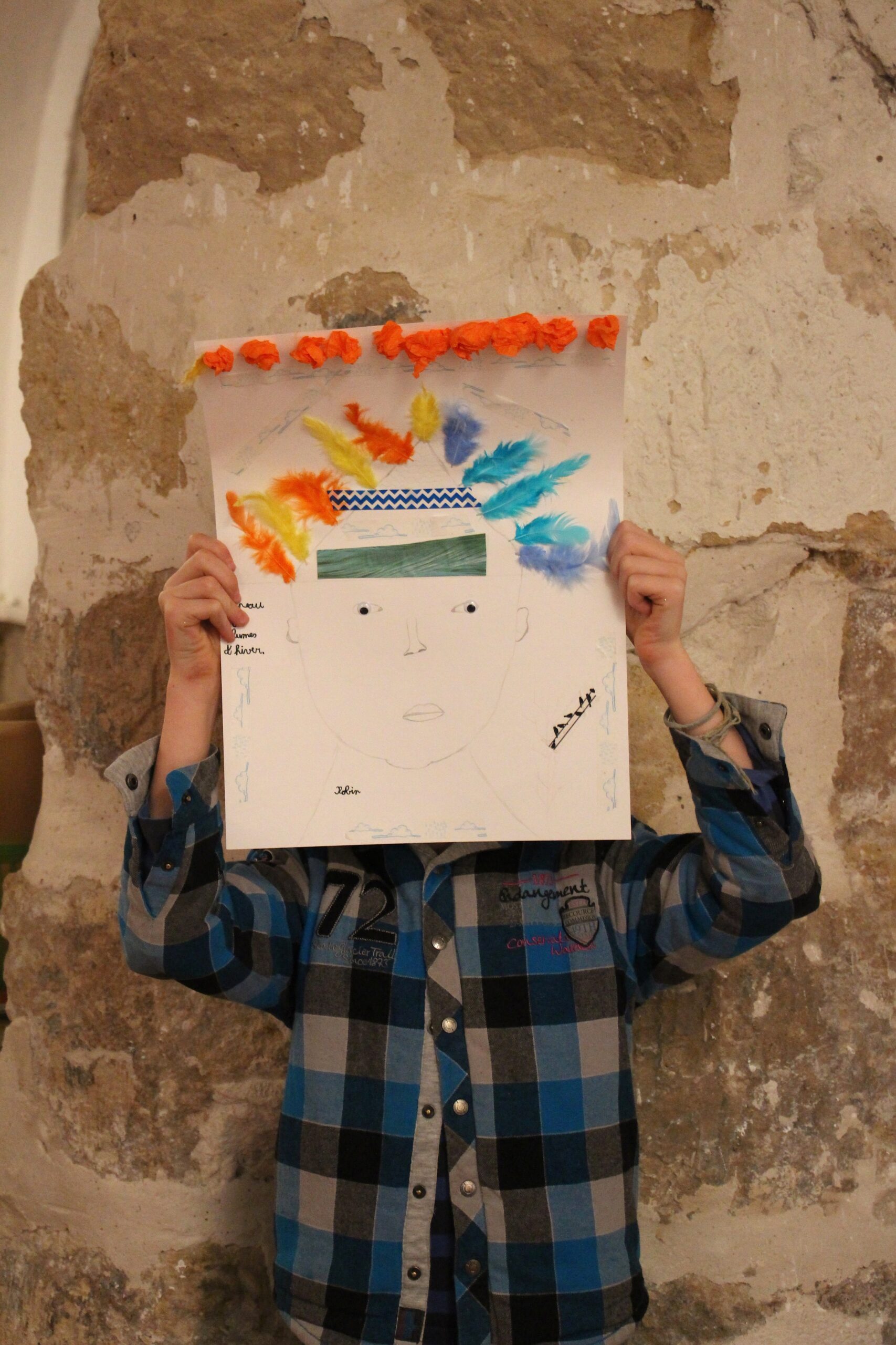 Après la lecture de L'Extraordinaire Chapeau d'Emilie de Satoshi Kitamura (Gallimard jeunesse), les enfants étaient invités à dessiner leur portrait et a créer un chapeau extraordinaire. Plumes, papier de soie, papier crépon, ruban adhésif de couleur, feutres, crayons, ... Dans un joyeux étalage de couleurs, les enfants ont laissé libre court à leur imagination. Chaque chapeau a une histoire, un pouvoir magique : ils sont tous chapeaux... Mais tous très différents !