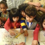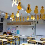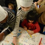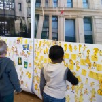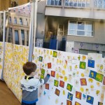 Une grande fresque avec les photos des façades des écoles a rassemblé tous les poussins créés dans les 28 classes. Les enfants les ont collés sur les panneaux au fur et à mesure de leur arrivée .