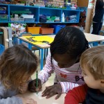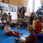 Un coin lecture installé à côté de la fresque leur a permis de retrouver, grâce à la complicité de la librairie de la rue Ramey " Les enfants sur le toit ", toutes les histoires de poussins de Claude Ponti.