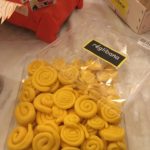 des pâtes à modeler et à la sauce tomate, des pizzas à la bave verte, des bouteilles de jus de menhir, des flacons de prout, des yeux d'iguane surgelés, des plateaux de melons en large, des tranches de... des bottes de..., des boîtes de... des rillettes de... des œufs de... des augerbines de... des gâteaux de ... du miel de... du coulis de... du rappé de... de la mousse de...