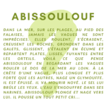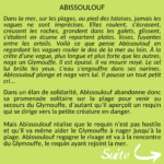 Dans la mer, sur les plages, au pied des falaises, jamais les vagues ne sont imprécises. Elles roulent, s'écrasent, creusent les roches, grondent dans les galets, glissent, s'étalent en écume et repartent plates, lisses, fuyantes entre les orteils. Voilà ce que pense Abissoulouf en regardant les vagues rouler le dos de la mer au loin. À la crête d'une vague, plus longue et plus forte que les autres, nage un Glymouffe. Il est épuisé. Il va mourir noyé. Le sel lui brûle les yeux. L'eau s'engouffre dans ses narines. Abissoulouf plonge et nage vers lui.