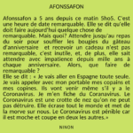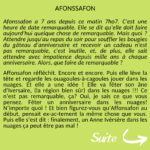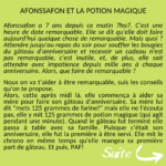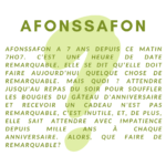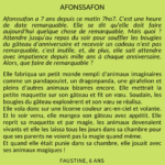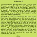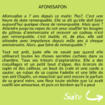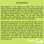 Afonssafon a 7 ans depuis ce matin 7ho7. C'est une heure de date remarquable. Elle se dit qu'elle doit faire aujourd'hui quelque chose de remarquable. Mais quoi ? Attendre jusqu'au repas du soir pour souffler les bougies du gâteau d'anniversaire et recevoir un cadeau n'est pas remarquable, c'est inutile, et, de plus, elle sait attendre avec impatience depuis mille ans à chaque anniversaire. Alors, que faire de remarquable?