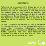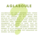 Aglaboule est une personne très timide qui vit sur les branches de lunettes. Elle n'est pas grande, on peut même dire qu'elle est toute petite. Il faut bien plus que des lunettes pour la voir. Quand les lunettes sont rangées dans leur étui, Aglaboule est dans le noir. Elle en profite pour dormir. Quand les lunettes sont sur un nez, Aglaboule voit le monde. Et si la personne à qui appartient le nez se déplace, elle voit beaucoup de monde. Un jour...