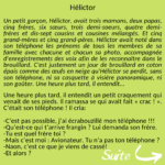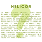 Un petit garçon, Hélictor, avait trois mamans, deux papas, cinq frères, six sœurs, trois demi-soeurs, quatre demi-frères et dis-sept cousins et cousines mélangés. Et cinq grand-mères et cinq grand-pères. Hélictor avait noté dans son téléphone les prénoms de tous les membres de sa famille avec chacune et chacun sa photo, accompagnée d'enregistrements des voix afin de les reconnaître dans le brouillard. C'est justement un jour de brouillard en coton épais comme des œufs en neige qu'Hélictor se perdit, sans son téléphone, ni sa casquette à visière panoramique, ni son goûter. Une heure plus tard, il entendit...
