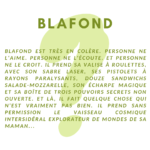 Blafond est très en colère. Personne ne l'aime. Personne ne l'écoute. Et personne ne le croit. Il prend sa valise à roulettes, avec son sabre laser, ses pistolets à rayons paralysants, douze sandwichs salade-mozzarelle, son écharpe magique et sa boîte de trois pouvoirs secrets non ouverte. Et là, il fait quelque chose qui n'est vraiment pas bien. Il prend sans permission le vaisseau cosmique intersidéral explorateur de mondes de sa maman...